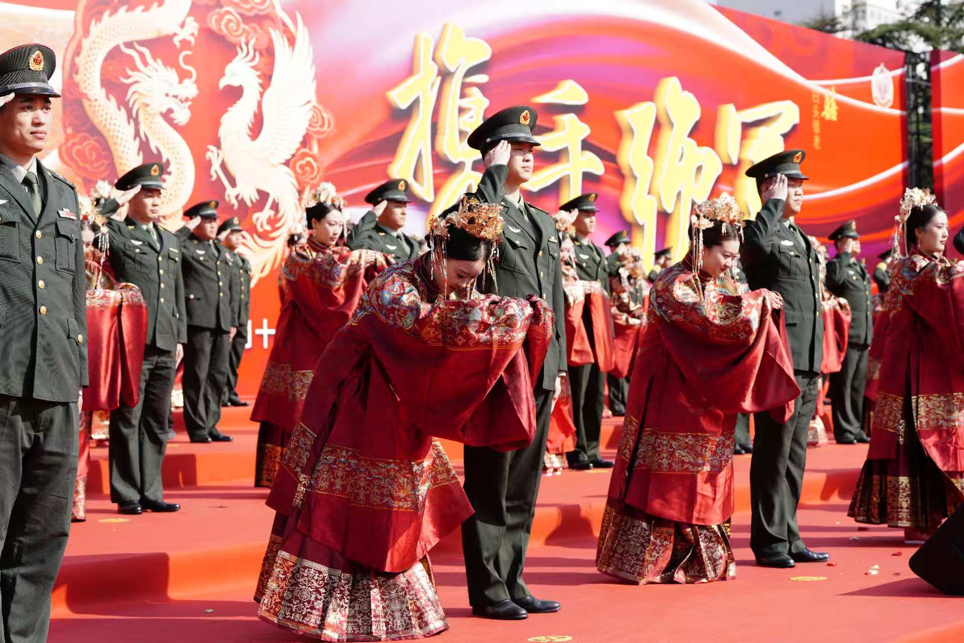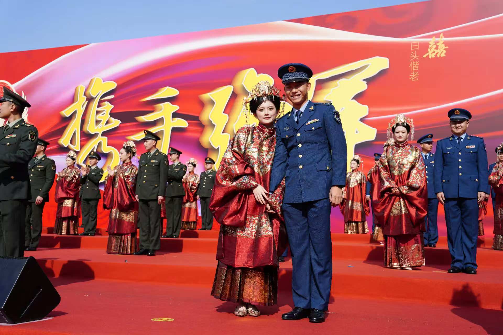 80对军地新人跨越军地界限,在国旗见证、军徽映照下,完成一场融合传统礼仪与军营特色的浪漫盛典,1000余名军地领导以及新人的战友、亲属及嘉宾共同定格这一“小家”与“大国”交相辉映的幸福时刻。