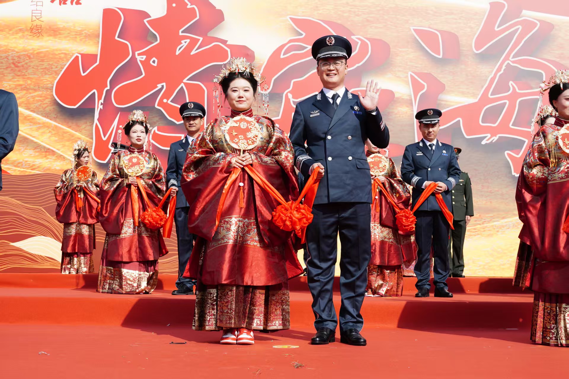 10时整,婚礼盛典准时拉开帷幕。伴随着庄重的旋律,国旗仪仗队迈着整齐步伐护送国旗至舞台中央,全场起立高唱国歌,嘹亮的歌声为婚礼奠定神圣基调。