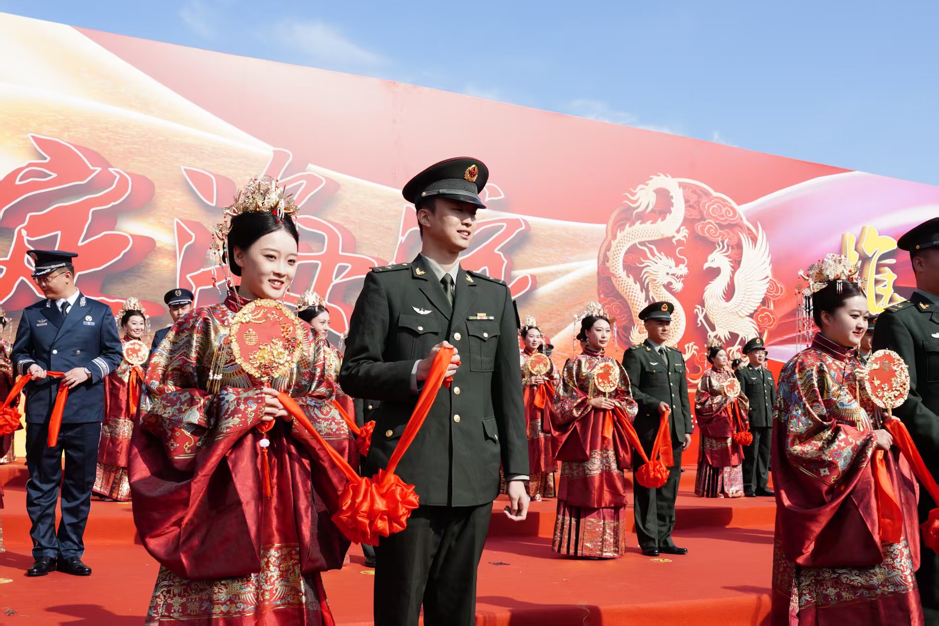 当日清晨5时,新人们就开始忙碌了。化妆师们细致勾勒,为新娘们描上精致妆容。7时30分起,“爱的痕迹”签到背板前新人提笔签名、合影留念;新郎与战友们组成迎亲队伍,完成充满军营特色的“上门迎亲”环节;室外场地上,新人们身着礼服拍摄创意照片与短视频,用镜头记录下婚礼前的甜蜜瞬间。