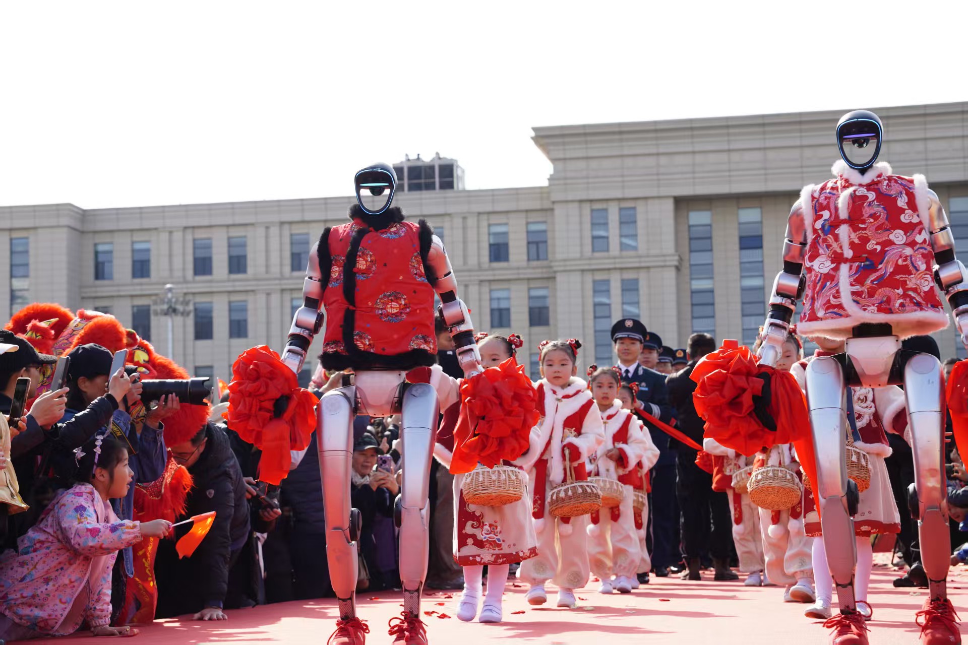 机器人手持彩带、8名孩童撒播鲜花引导,新人们手牵连理绸,依次穿过“荣誉幸福之门”登台站位。