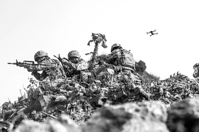 武警广西总队河池支队特战队员利用无人机进行协同侦察。蔡朝桂摄/光明图片