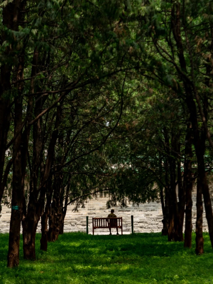 除了新晋走红的“跳墙”打卡照,拍摄地坛公园“看海”照也是持续了几年的热门打卡活动。在阳光的照耀下,地坛东门附近墙上砖块的纹理和树影交织,宛如波光粼粼的海面,再搭配上长椅,就能拍出“公园看海”的浪漫画面,这一巧思吸引了众多游客用镜头捕捉这份意外的美好。