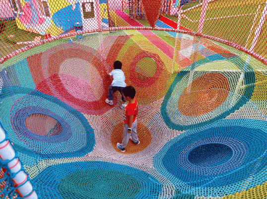 亦花园西侧的巴哩啵哩运动探索乐园有6000平方米,双层的“天空之城”爬架让娃爬到爽,五条彩虹滑道能反复“冲”,爸爸妈妈也能跟着在高空闯关区跑一圈儿,立马找回小时候的快乐。