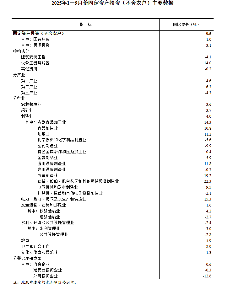 2025年1—9月份,全国固定资产投资(不含农户)371535亿元,同比下降0.5%(按可比口径计算,详见附注7)。其中,民间固定资产投资同比下降3.1%。从环比看,9月份固定资产投资(不含农户)下降0.07%。