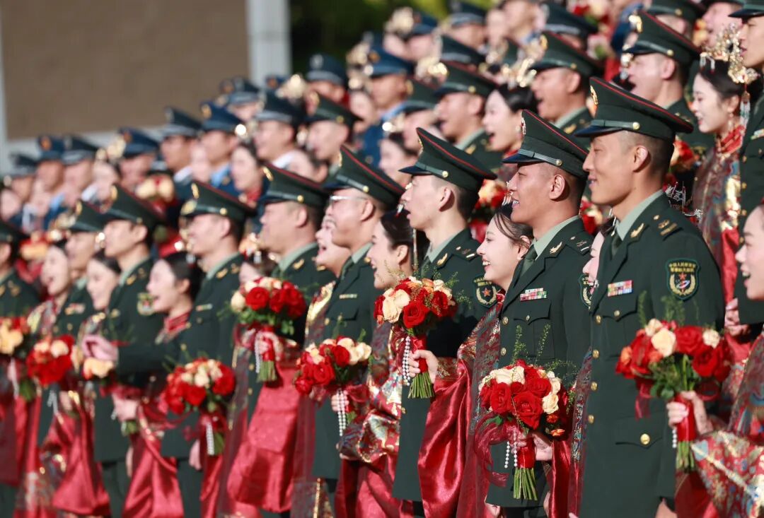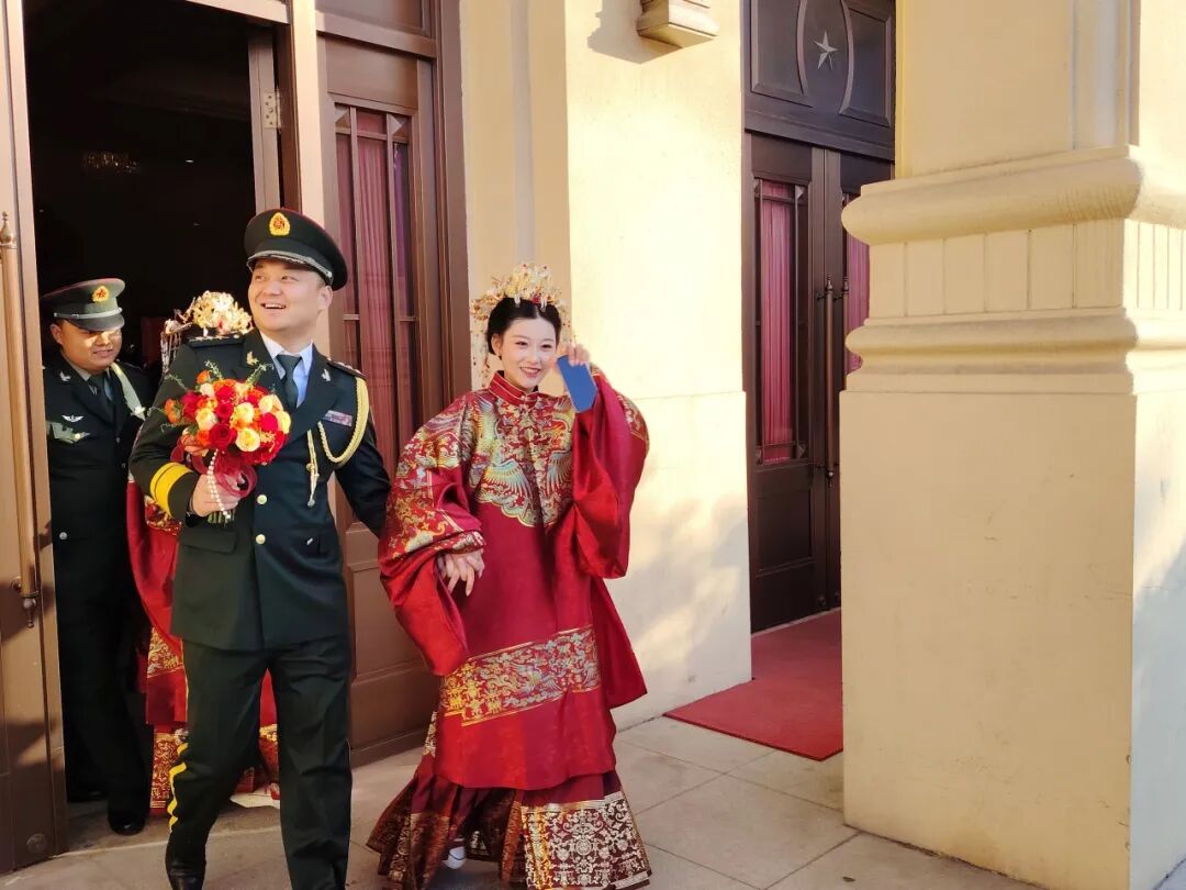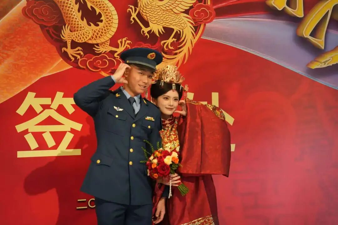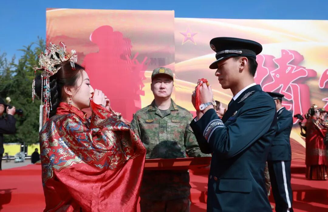 婚礼仪式上,环节丰富且意义深远。新人却扇纳祥,新娘将团扇交予新郎,寓意开启崭新生活;礼拜天地时,一拜天地,感恩祖国山河无恙、国泰民安,二拜高堂,感恩父母养育之恩、感恩部队培养之情,夫妻对拜,许下相守一生的诺言。