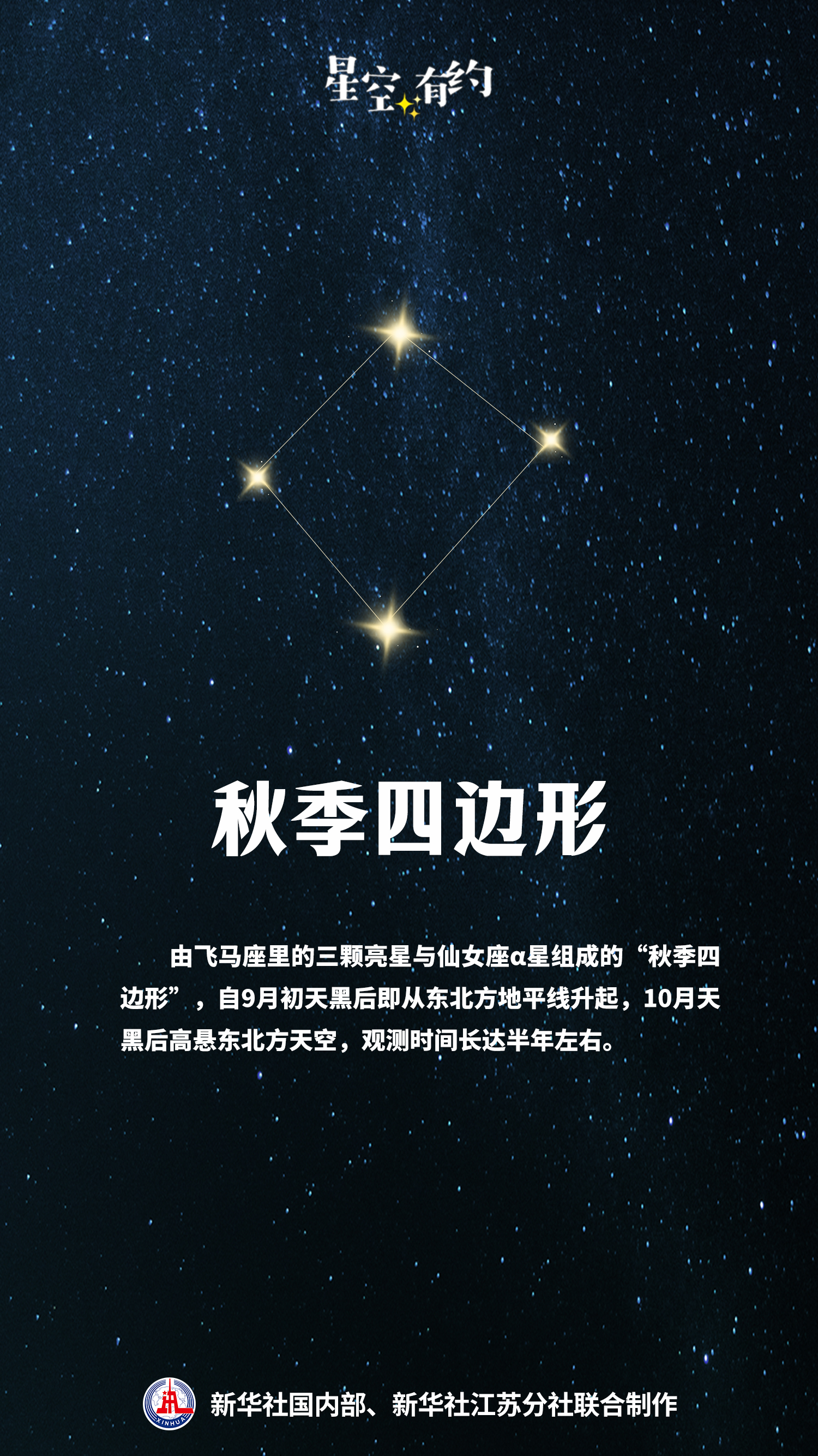 随着夏夜银河慢慢西沉,以飞马座和仙女座为代表的秋季星空开始占据夜空“舞台”的中央。“由飞马座里的三颗亮星与仙女座α星组成的‘秋季四边形’,在亮星较少的秋季夜空中尤为突出。它们自9月初天黑后即从东北方地平线升起,10月天黑后高悬东北方天空,观测时间长达半年左右。”王科超说。