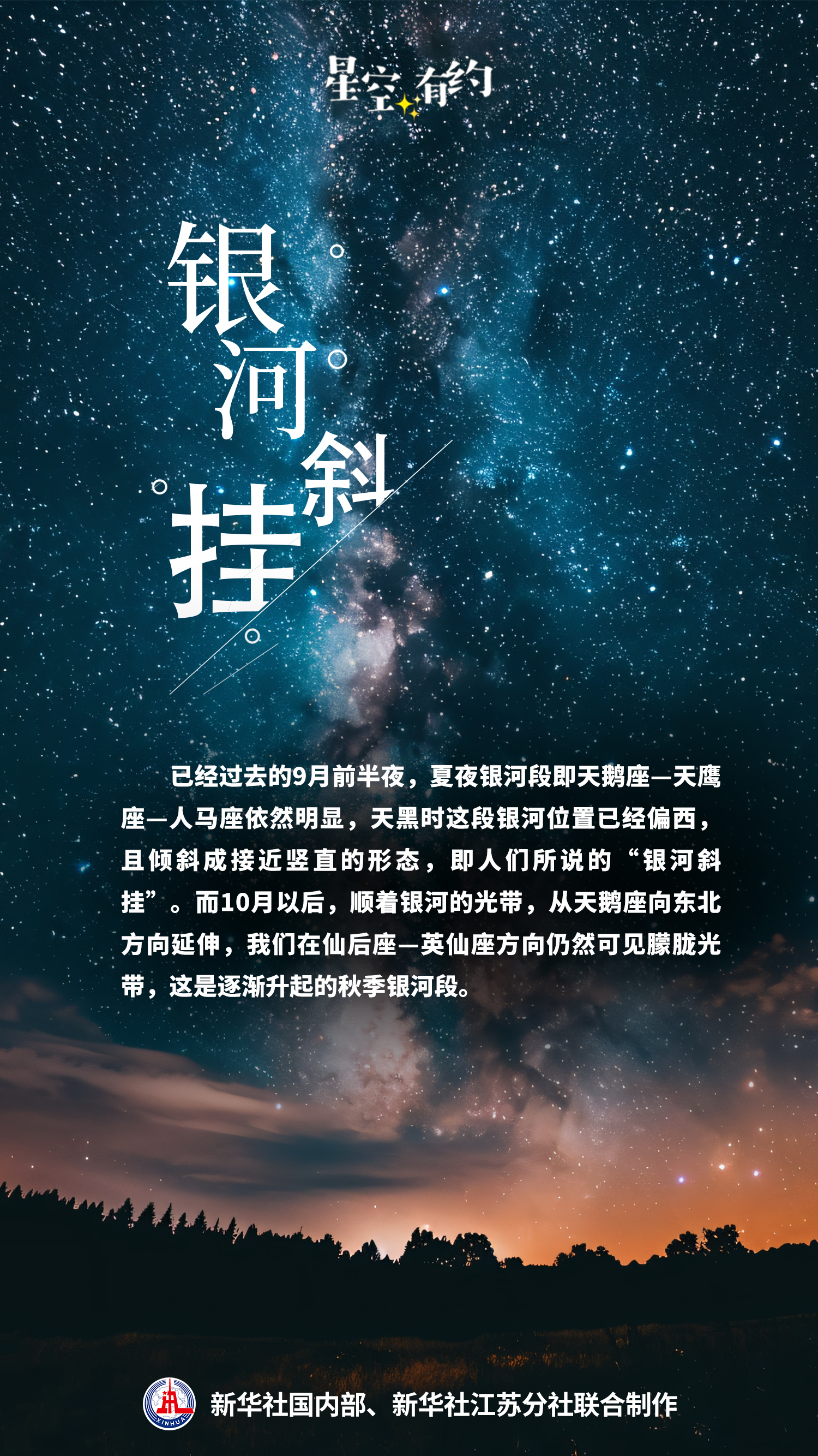 已经过去的9月前半夜,夏夜银河段即天鹅座—天鹰座—人马座依然明显,天黑时这段银河位置已经偏西,且倾斜成接近竖直的形态,如“光瀑”垂落天际,即人们所说的“银河斜挂”。而10月以后,顺着银河的光带,从天鹅座向东北方向延伸,我们在仙后座—英仙座方向仍然可见朦胧光带,这是逐渐升起的秋季银河段。秋季银河段是我们转向银河系盘外方向所看到的景象。