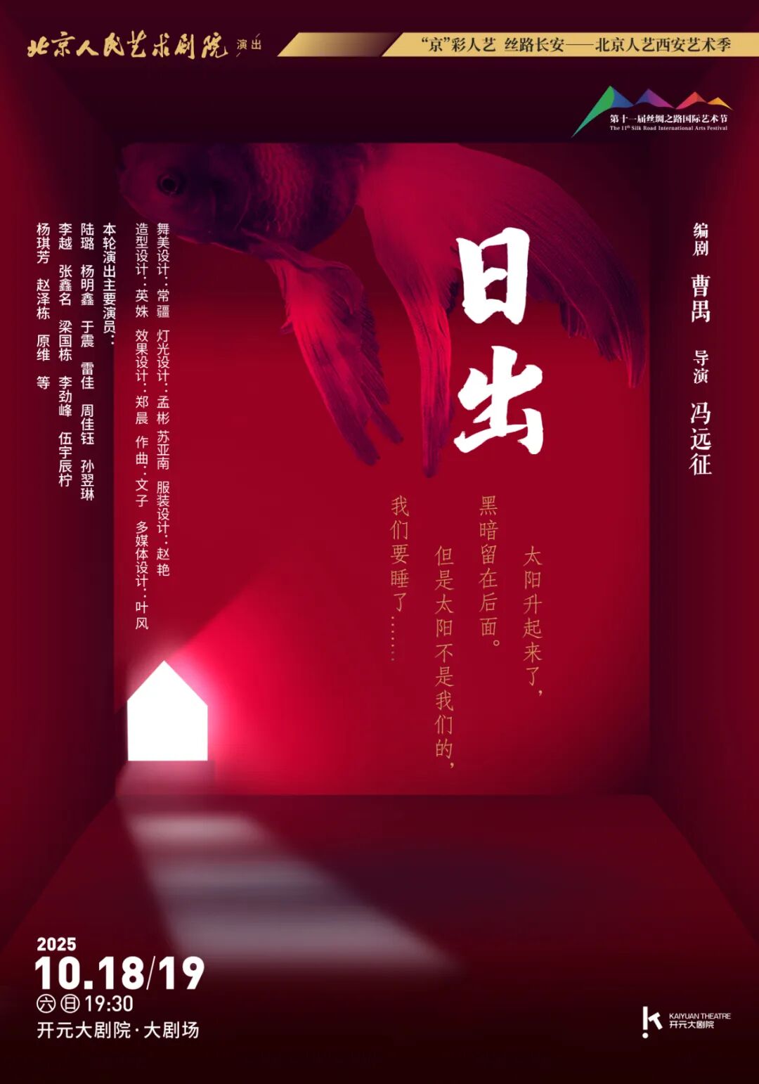 秋染长安,艺韵绵长。10月16日,第十一届丝绸之路国际艺术节在陕西西安正式开幕,北京人民艺术剧院将携四部精品剧目——《日出》《赵氏孤儿》《哈姆雷特》《正红旗下》依次亮相本届丝艺节。10月18日到10月31日,在千年古都的金秋盛景中, “北京人艺西安艺术季” 将在开元大剧院以八场精彩演出为西安观众带来一场高品质的戏剧盛宴。
