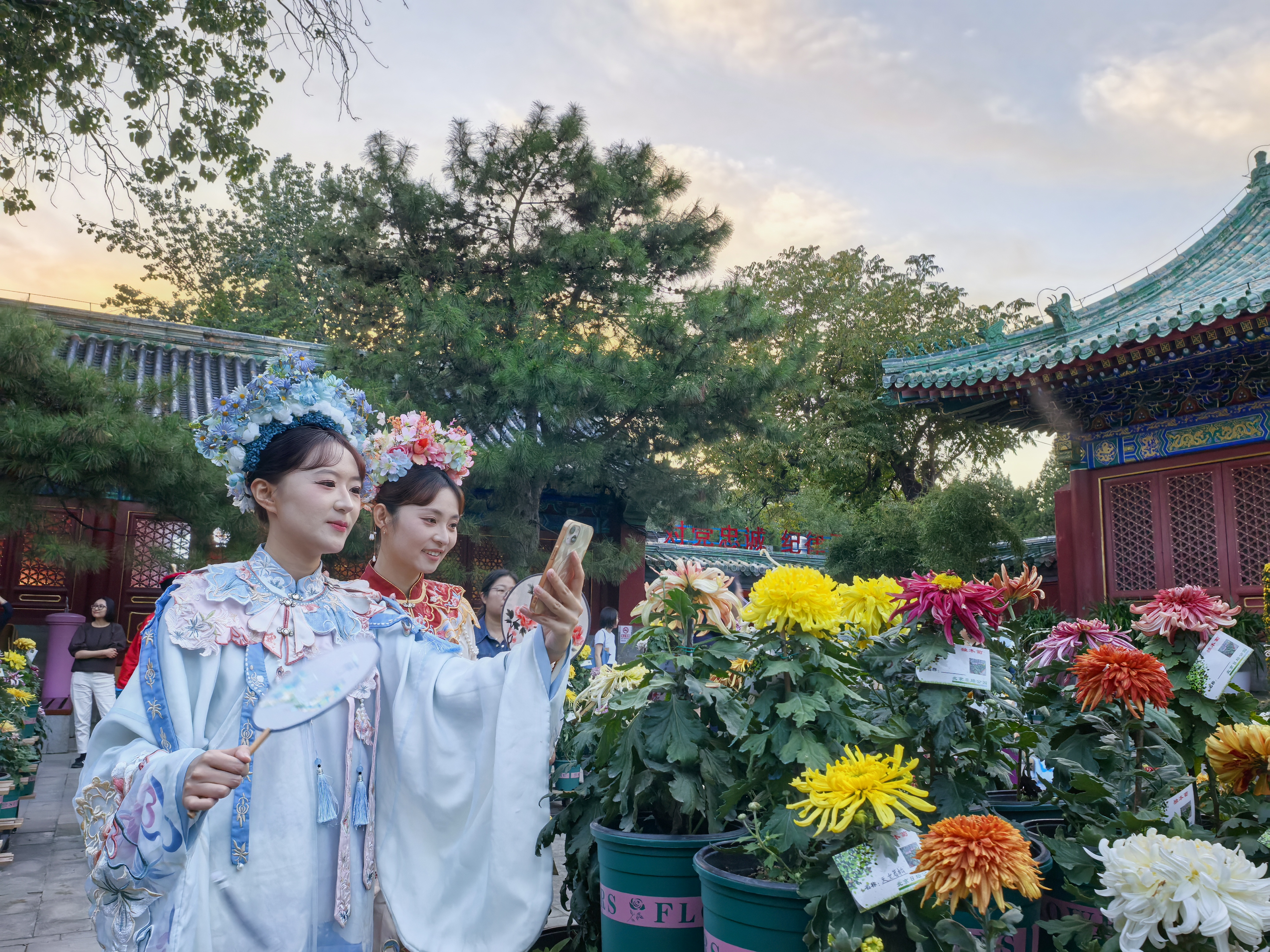 记者走进日坛公园时正值一个工作日的上午。深秋的阳光是橙色的,穿过翠绿古柏投射在红墙上,温暖静谧。“菊花谷就在前边!”两个身着汉服的年轻女孩,叽叽喳喳兴奋地聊着,循着地图、跟随人流快步疾走。