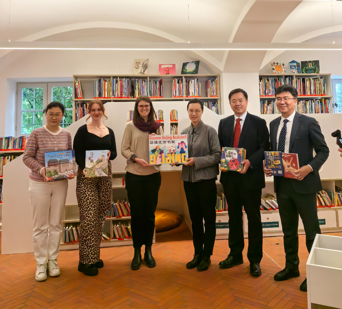 当地时间10月17日,正在德国参加第77届法兰克福国际书展的北京展团专程前往慕尼黑国际青少年图书馆,举办“品读北京”书架设立暨图书捐赠仪式。