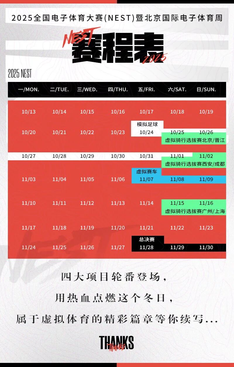 2025全国电子体育大赛(NEST)暨北京国际电子体育周燃情启幕!虚拟骑行、虚拟赛车、模拟足球、虚拟赛艇四大项目轮番登场,线上线下双线并进,等你来战!