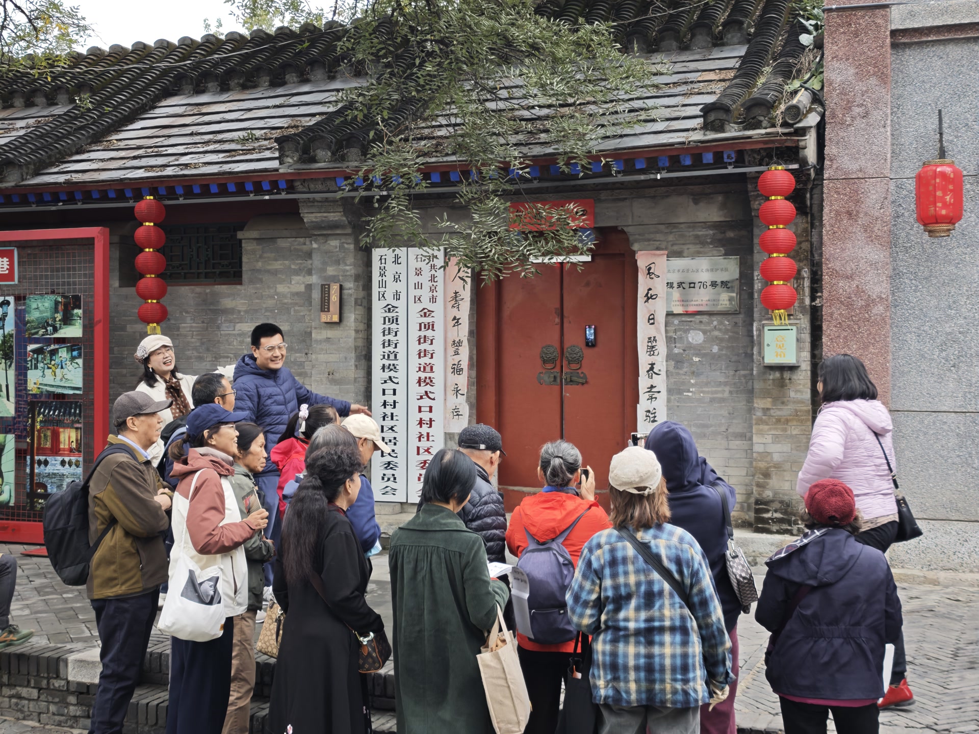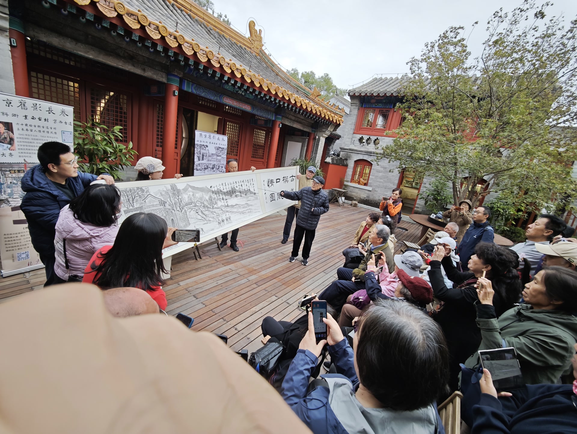 活动中,何大齐分享了作品的创作缘起,为留下京西古道的珍贵记忆,他持续30年开展古道速写抢救性记录,在长卷中特意保留了驼队客栈、铁匠铺等已消失的业态风貌。他还带领居民游客走访模式口街区,先后到百年布店原址、过街楼遗址、龙王庙广场等地,通过长卷旧貌与现实场景相对比,生动呈现古街历史文化的发展变迁。