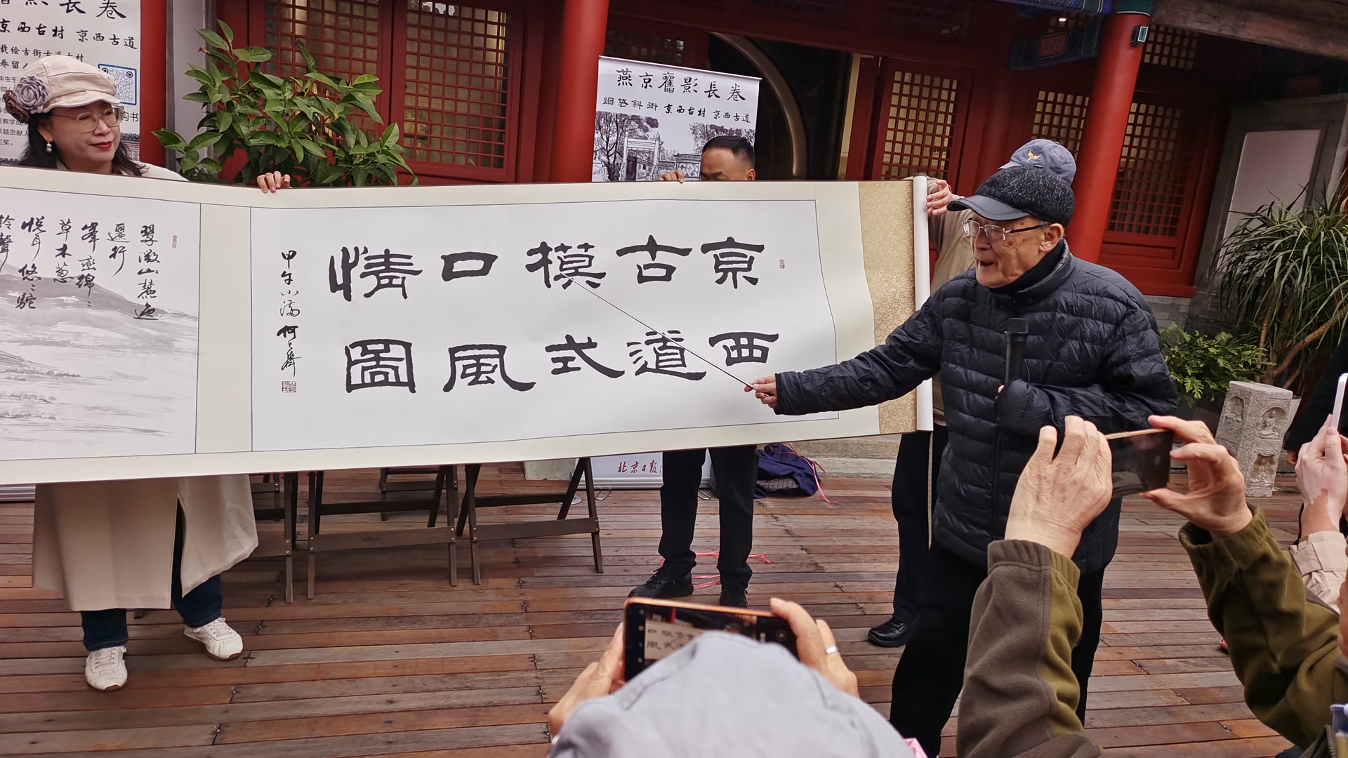 活动现场人气十足,街区居民、来往游客纷纷驻足聆听。一位将近60岁、腿脚不便的老先生,坚持听完了全程。他是何大齐40年前的学生,此次因这幅长卷在古道与老师重逢,难掩激动之情。
