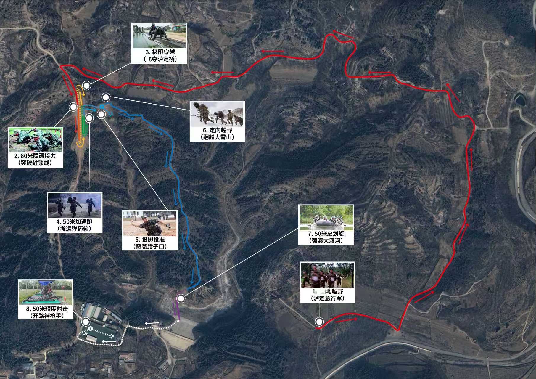 全天赛事共计6小时,午间休息2小时,融合山地武装越野、军事体育和长征历史战役元素,设置泸定急行军(2.4公里山地越野)、突破封锁线(80米障碍接力)、飞夺泸定桥(极限穿越)、搬运弹药箱(50米加速跑)、奇袭腊子口(投掷投准)、翻越大雪山(定向越野)、强渡大渡河(50米皮划艇)、开路神枪手(50米精度射击)8个项目,突出普及性、专业性、安全性、趣味性和观赏性。