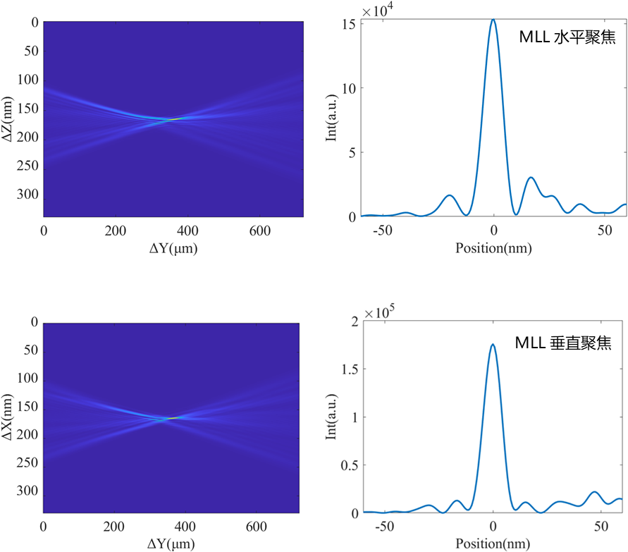 硬X射线纳米探针线站:HEPS研制多层膜聚焦透镜的水平、垂直聚焦散焦图(第三次现场测试数据),水平聚焦半高宽10.5nm,垂直聚焦半高宽12.6nm。