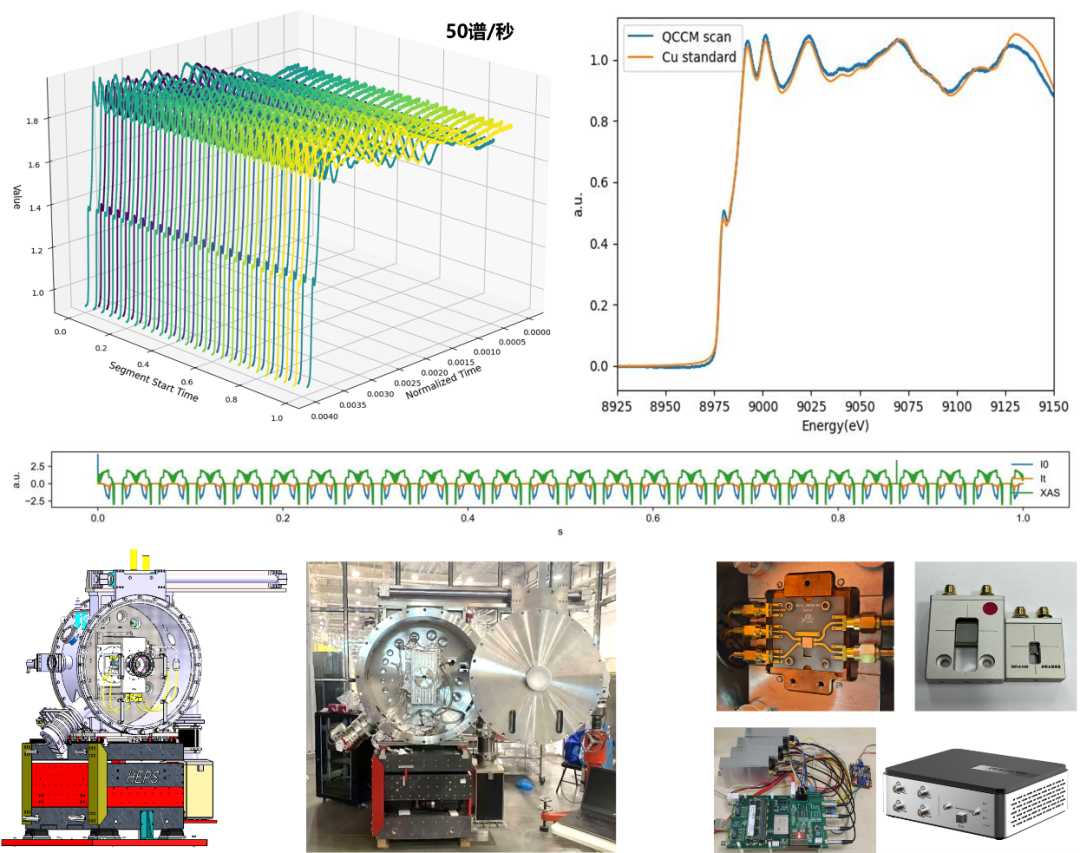 图:Cu箔XANES随时间的谱图展示及其与常规步进采集数据的对比。X射线吸收谱学线站:HEPS团队通过全套自研设备(快扫单色器及运动控制、金刚石探测器及采集电子学),实现了单谱20ms(50谱/秒)的XANES时间分辨能力。