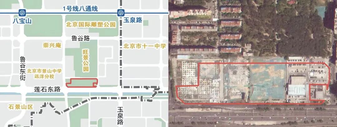 项目位于石景山区八宝山街道莲石路与石槽中街交汇处,南邻莲石东路辅路北侧,北接规划三路,西邻雕塑园南街,东靠石槽中街。总占地面积4.96公顷,总建筑面积达5.37万平方米。原址为玉泉鲁谷建材市场。
