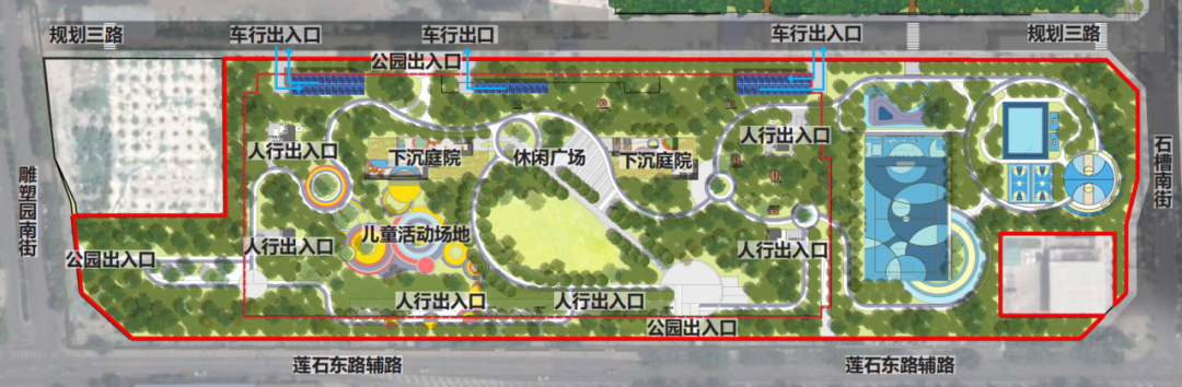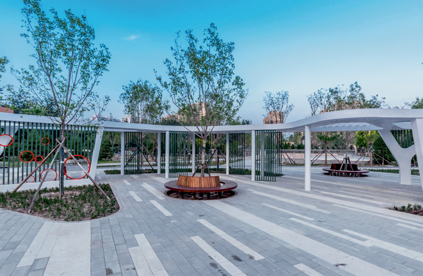 项目在规划设计阶段,充分考量城市更新的多维度、多层次需要,将公园绿地与地下停车库进行有机整合,形成了独具特色的“调色板智慧花园”概念。项目团队对场地现状展开深入剖析,并结合周边环境与居民需求,提出了“绿色生态+智慧停车”的复合型设计理念,其目的在于达成生态效益与功能效益的双赢局面。地上公共空间以“生活遇见色彩·色彩感动生活”作为主题,配置多样化的健身游憩设施,致力于打造一个色彩斑斓、功能多元的城市绿地,以此提升城市空间的品质,同时为市民提供一个集休闲娱乐、健身游憩等功能于一体的全新场所。地下部分则借助采用先进的停车库设计理念,通过优化停车流线、提高车位利用率等一系列举措,实现了地下停车空间的高效便捷利用。