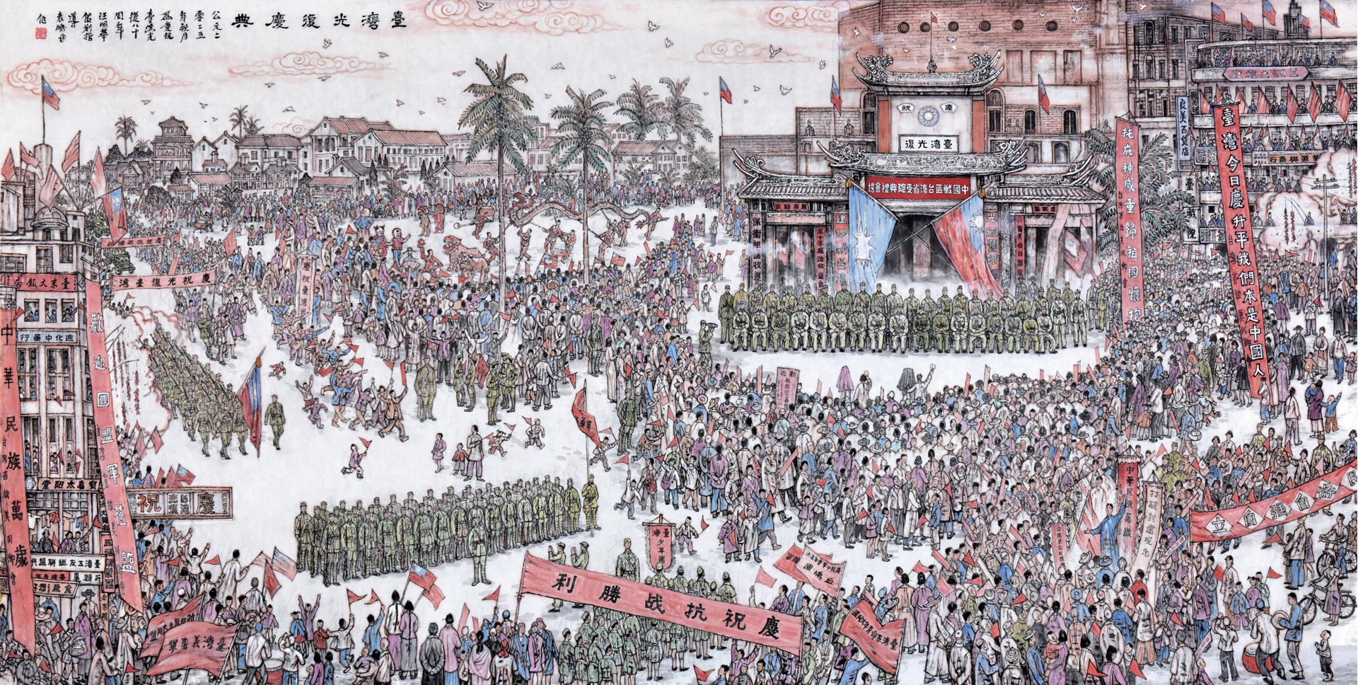 军旅画家袁鹏飞曾任原兰州军区政治部文艺创作室副主任,他历时三个多月创作了《台湾光复庆典》的画作,场面宏大、气氛热烈,以艳丽的色彩反映出庆祝胜利的激昂情绪和热烈场景。他表示,台湾光复80周年,两岸同胞应该以笔墨为媒,以文化为根,铭记那段用血泪写就的抗争史。