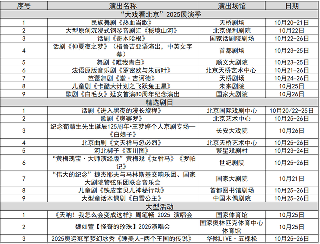 “大戏看北京”2025展演季以“文艺展新姿 精品献人民”为主题,重点推出精品大戏、梨园大戏、海外大戏、新锐大戏、演艺新空间、高校大戏六大展演单元,还引入沉浸式体验、超高清第二现场等新型呈现形态,举办商圈戏剧市集等多种形式的活动。在为期三个月的时间里,好戏连台、全城有戏,80余家演出单位在30余家专业剧场、20多个演艺新空间呈现100部精品剧目,涵盖歌剧、话剧、芭蕾舞、戏曲等10余个门类,为中外艺术家搭建高端交流展示平台,为首都演艺市场注入澎湃动能。