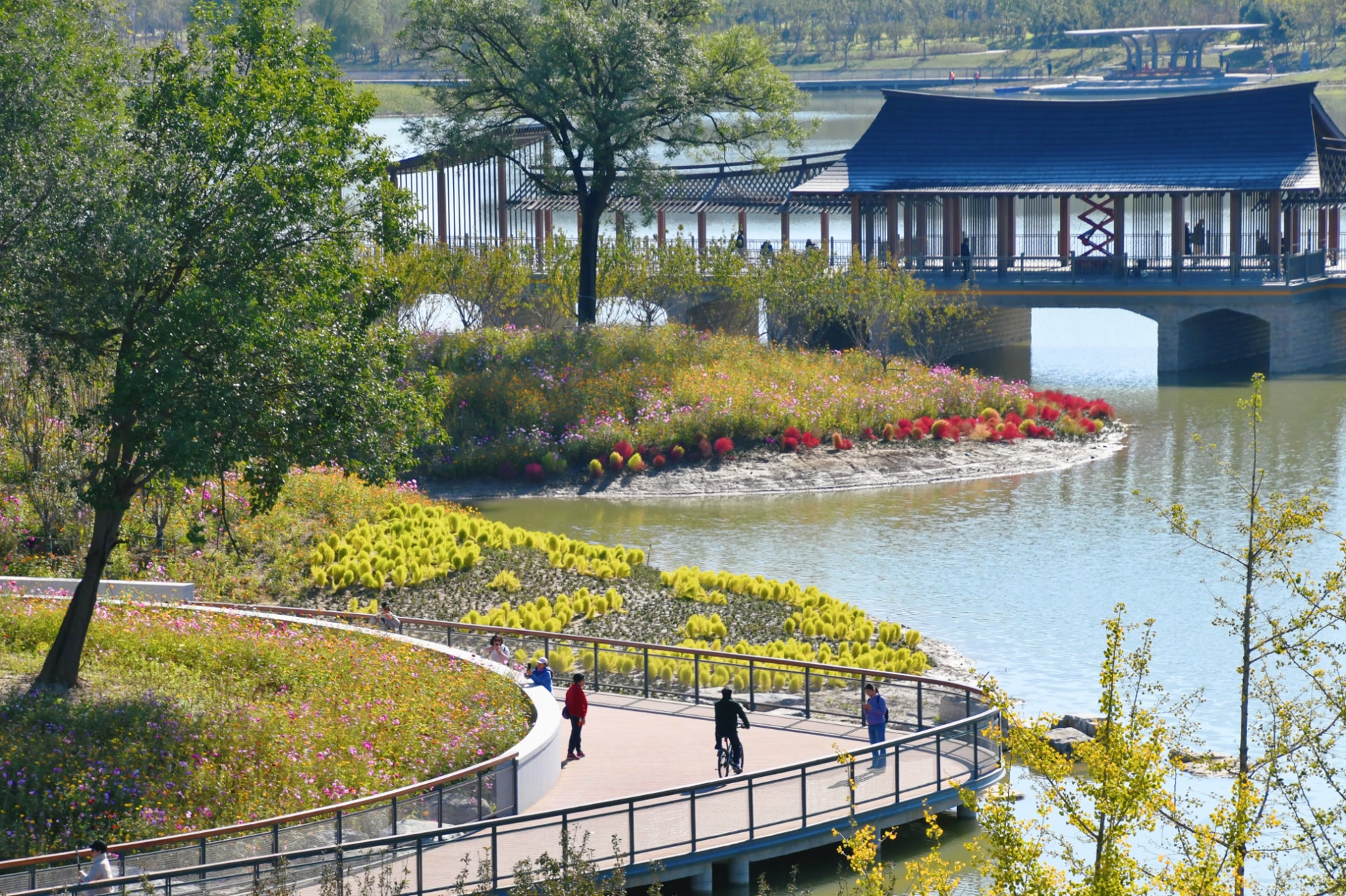 步入园区,开阔清澈的玉湖是整个公园的视觉中心,两条长堤蜿蜒环绕湖面,十二座小岛星罗棋布。步移景异,无论是俯瞰堤岛纵横的自然景象,还是近赏波光粼粼的湖面,都能沉浸式感受湿地的独特魅力。