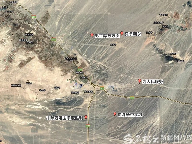 他们根据飞行训练的航线,用“刮除黑石露出碱土”的方法,历经数月在戈壁滩用铁锹挖出了“为人民服务”等5处地标大字。其中,“为人民服务”单字长宽各达50米。在那个没有卫星定位的年代,这5组大字就如同飞行学员的“空中灯塔”。