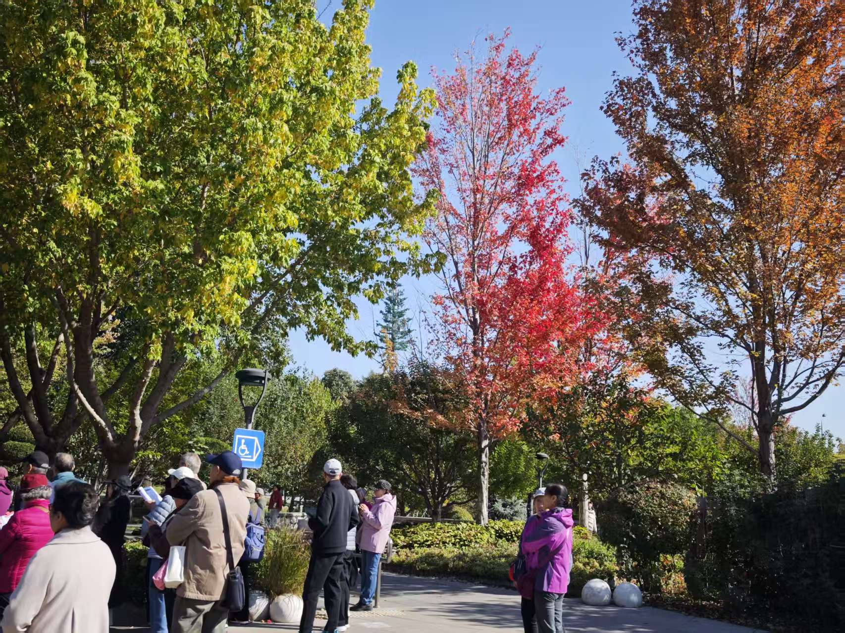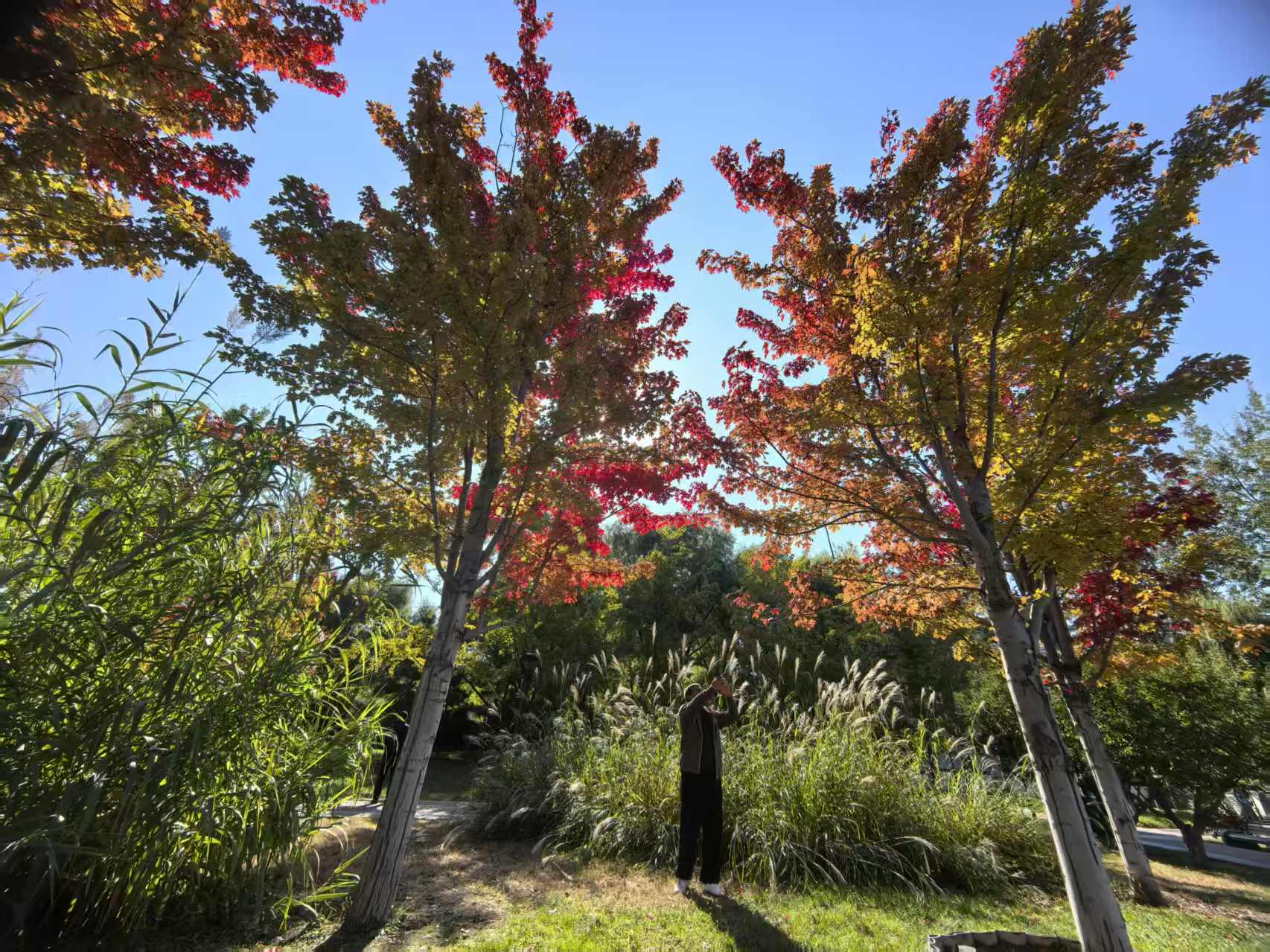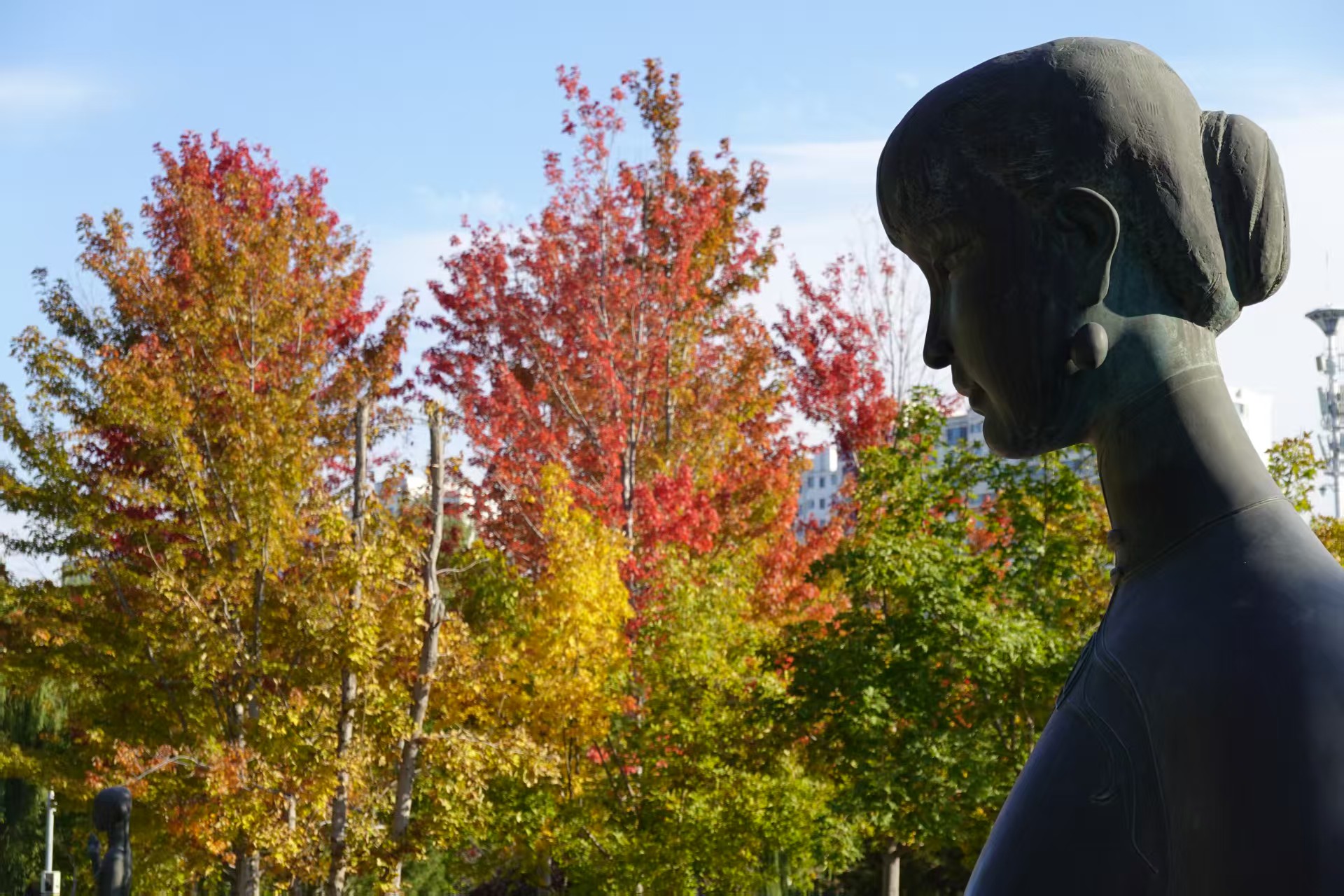 北京雕塑公园红枫似火,艺术与自然交相辉映