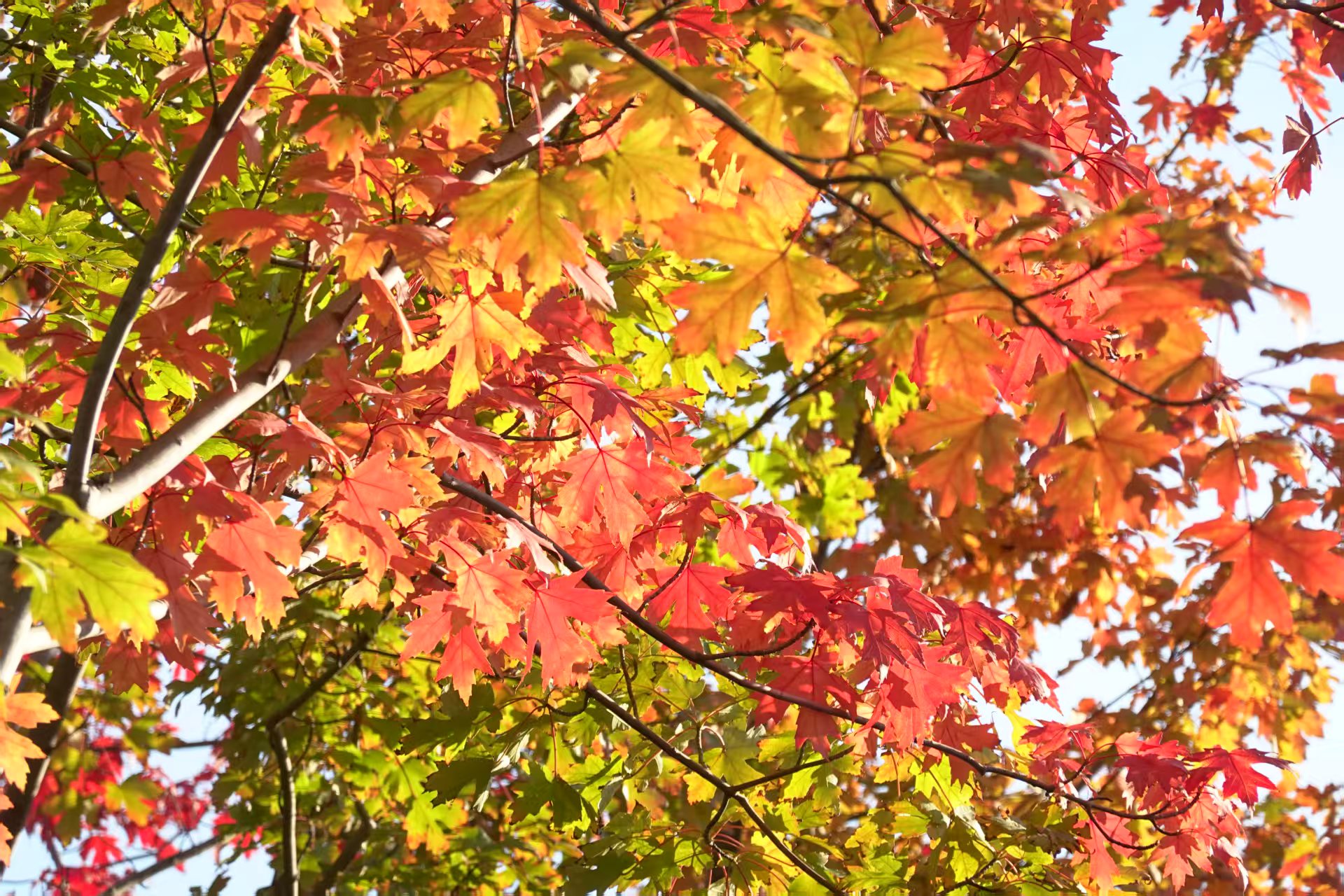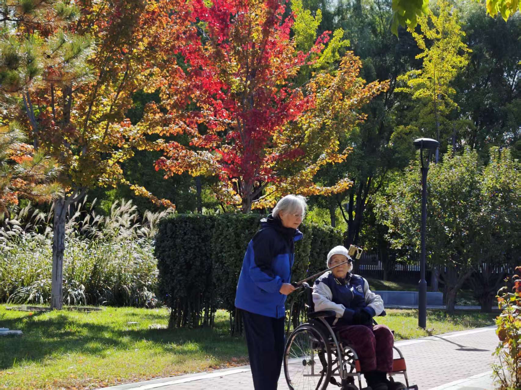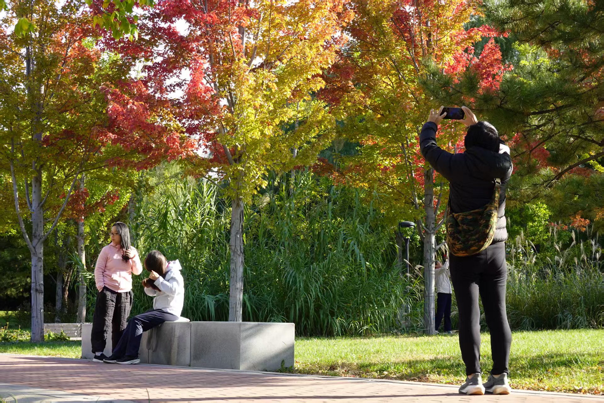 北京雕塑公园红枫似火,艺术与自然交相辉映