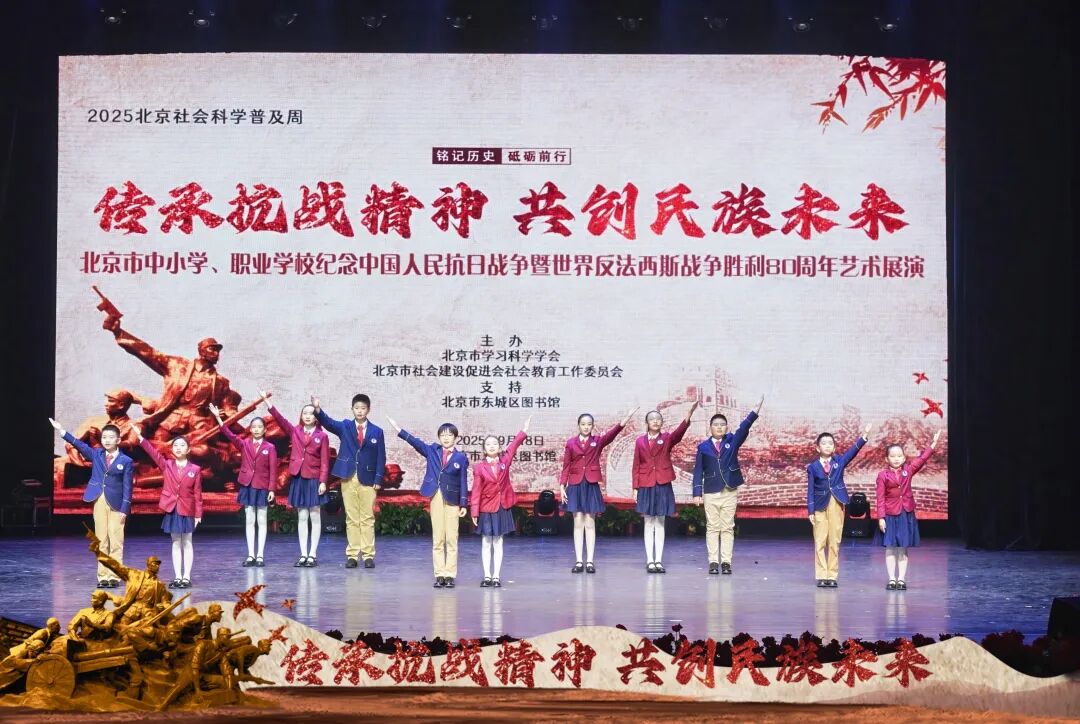 “传承抗战精神 共创民族未来”——北京市中小学生、职业学校纪念中国人民抗日战争暨世界反法西斯战争胜利80周年艺术展演,以诗歌朗诵、器乐合奏、书画作品展示等多样化的艺术形式,引导学生深入了解抗战历史,铭记英雄事迹,传承红色基因。通过艺术展演的形式,为新时代青少年树立正确的历史观、家国观,培养青少年爱国情怀和社会责任感。