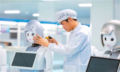 在浙江省金华市金东区浙江恒东智能科技有限公司生产车间,工人在组装智能机器人。该公司生产的机器人广泛应用于政务、医疗、养老、养殖等行业。胡攀学摄(人民视觉)