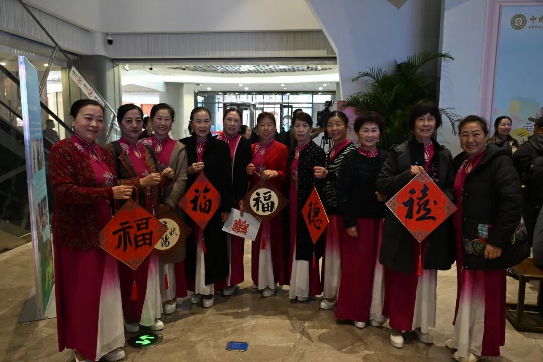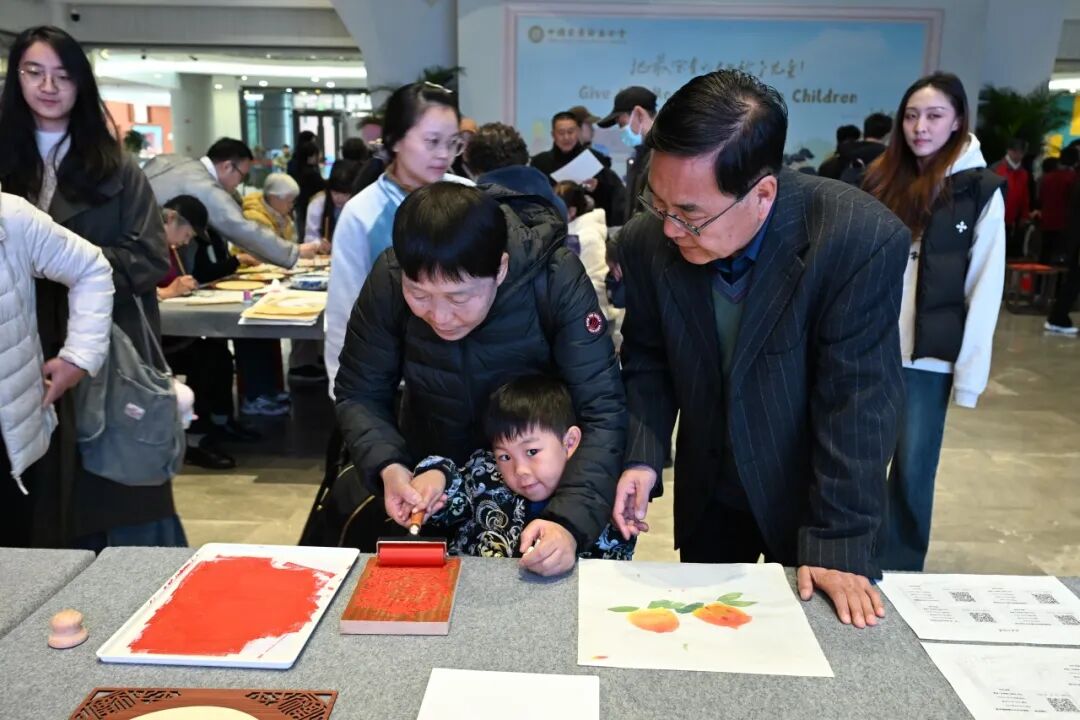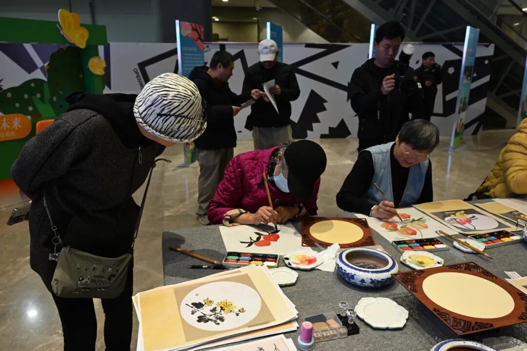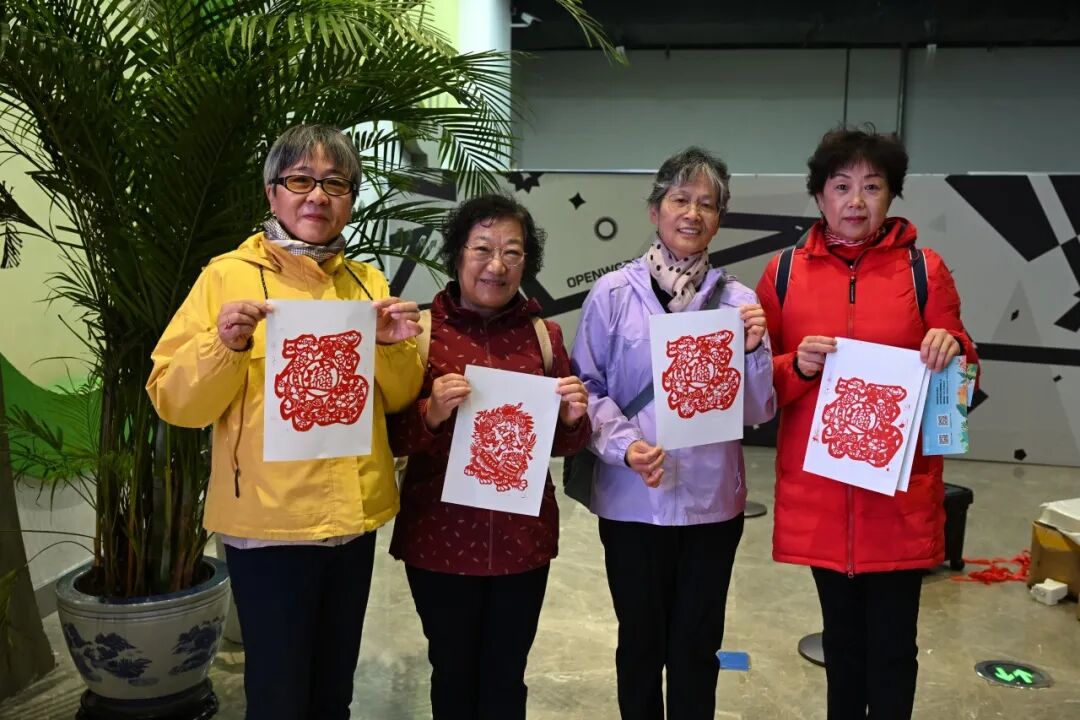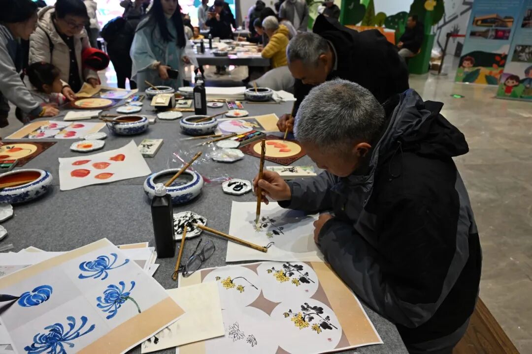 一旁的国画、版画体验区也聚集了许多老人和孩子,国画区以“秋日雅韵”为主题,在指导老师帮助下进行创作,有人初次尝试调色,更有老人合作绘景,现场充满创作乐趣。版画区围绕“吉庆祥和”主题,指导教师全程示范描图、刻版、拓印步骤,初次接触版画的老人在帮助下完成作品,兴奋地与作品合影。