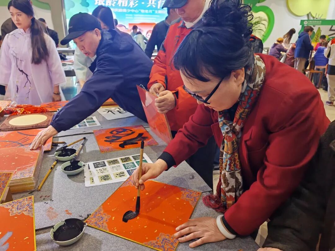 宋庆龄青少中心一层中庭,书法、国画、版画三大传统艺术体验区同步开放,吸引百余名老人参与。书法区,“福”“寿”“重阳安康”等临摹帖整齐摆放,老人们握笔书写,老师在一旁细心指导握笔姿势。