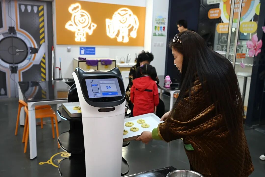 走进机器人餐厅,健康烘焙课上,一台机器人将烘焙食材送到现场体验课程的老人面前,老人们跟着老师学习制作饼干,从揉面、塑形到烘烤,每一个步骤都充满乐趣,当香甜的饼干出炉时,大家分享着自己的劳动成果,脸上满是幸福的笑容。“我是第一次做这种小糕点,还可以跟机器人互动,挺新颖的。”孙女士说。