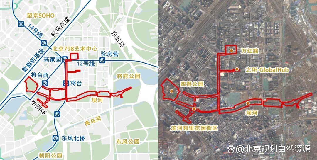 改造覆盖五大核心点位,辐射坝河2.3公里滨水空间及北岸功能区,总建设规模37.08公顷。其中,坝河滨水空间治理,将21.65公顷滨水空间打造为蓝绿交织的生态艺术水岸;之所GlobalHub盘活空置大厦,更新成为吸引“专精特新”企业的智慧办公新地标;万红路慢生活街区活化闲置楼宇,打造2.8万平方米低密度慢生活消费场景;四得公园全龄友好升级改造,新增智慧型运动场地;首都机场高速沿线(将台滨河邻里花园街区)综合整治提升项目串联四得公园、将台站及坝河,以完整社区理念打造花园式街区,激活沿街公共空间活力。