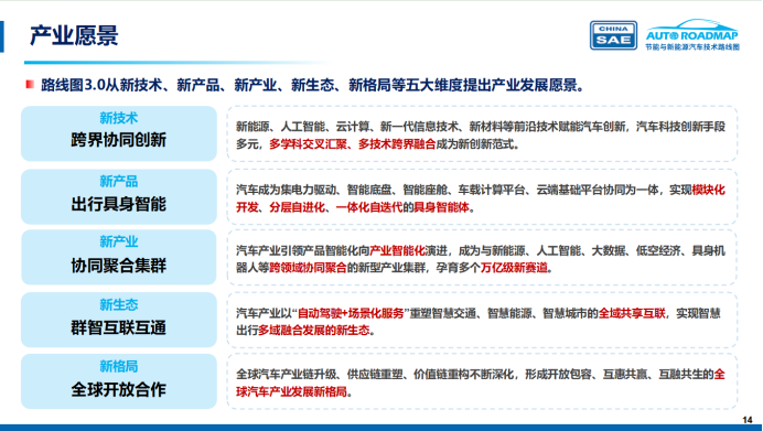 此外,《路线图3.0》从绿色低碳可持续发展、安全高效智慧出行、跨界经济融合发展、和谐友好汽车社会四个方面,提出了汽车产业未来的社会愿景,从新技术、新产品、新产业、新生态、新格局等五大维度提出产业发展愿景。