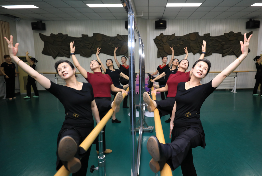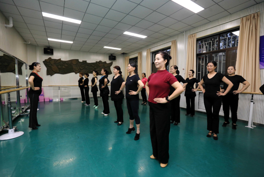 “五六七,走……”课程开始,大家抬头挺胸,提起精神气儿,在老师的指导下踮起脚尖、收起腹部,全神贯注学起了舞蹈动作。