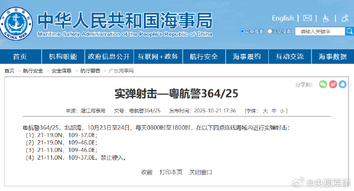 据中国海事局网站消息,湛江海事局发布航行警告,10月23日至24日,每天8时至18时,北部湾部分海域进行实弹射击,禁止驶入。