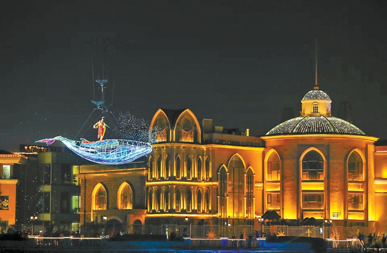白天秋叶绚烂,夜晚光影流转。夜晚的亮马河畔灯光璀璨,贝壳剧场化作浮光岛屿,舞台与河水连成一幅柔光画布,演员脚踏光束掠过湖面,在水域中央与光景鲲鹏共舞……在2025北京朝阳国际灯光消费季上,本市首个跨水域空中光影表演“飞跃蓝湖”格外吸睛。“这里好多光影设施和表演我都是第一次看到,实在太美了!”游客蒋先生手中的相机一刻都没闲着,“本来还担心晚上没啥可玩的,没想到赶上了灯光节,简直就像童话世界一样,太梦幻太美了!”
