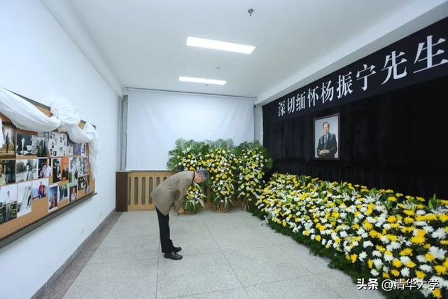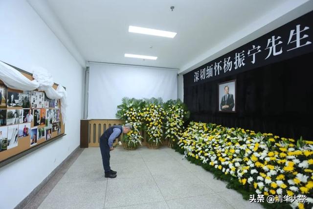 朴素无华的缅怀室里,黄白色菊花几乎铺满了整个房间。墙上正中的黑色相框里,杨振宁先生面带微笑,目光仍如往昔般睿智,注视着前方。