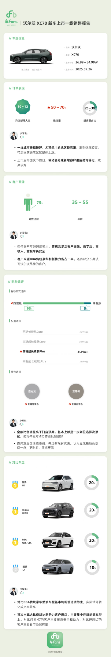10月15日,沃尔沃全新XC70上市销售快报显示,四驱版本成为消费者的理想选择,占比高达95%,彰显了用户对沃尔沃品牌安全标签的信赖,以及对全场景无忧体验的需求,印证了其精准的产品定位。