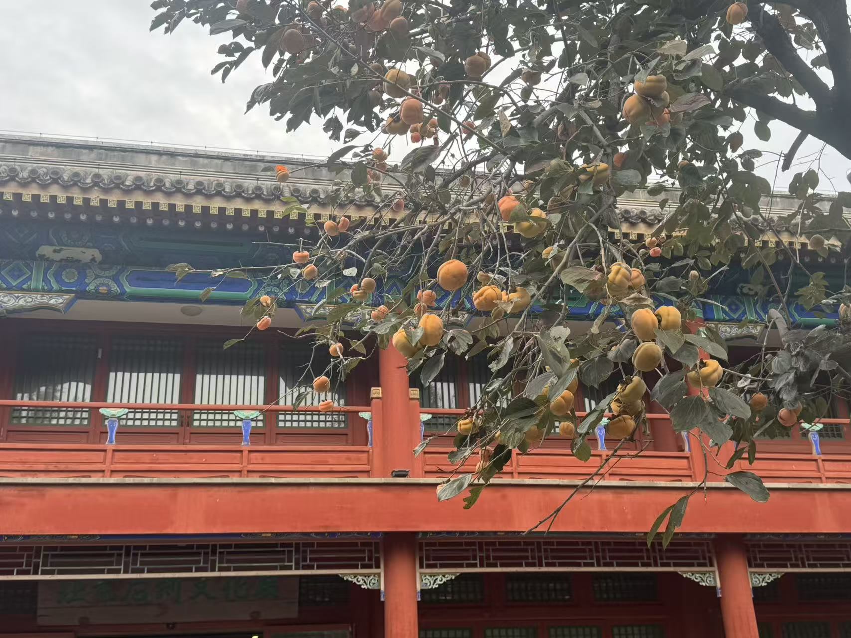 走进馆内,只见金刚宝座塔前东西两侧的柿树上,一盏盏“小灯笼”缀满枝头。阳光一照,透亮橙红。一阵秋风吹过,叶片沙沙作响,偶有熟透的柿子“啪嗒”落地。端着专业相机的刘先生,每年霜降后都来“蹲点”。在他面前,不时有穿汉服的姑娘、拎反光板的摄影师、举手机自拍的一家三口穿行而过。