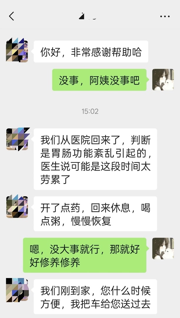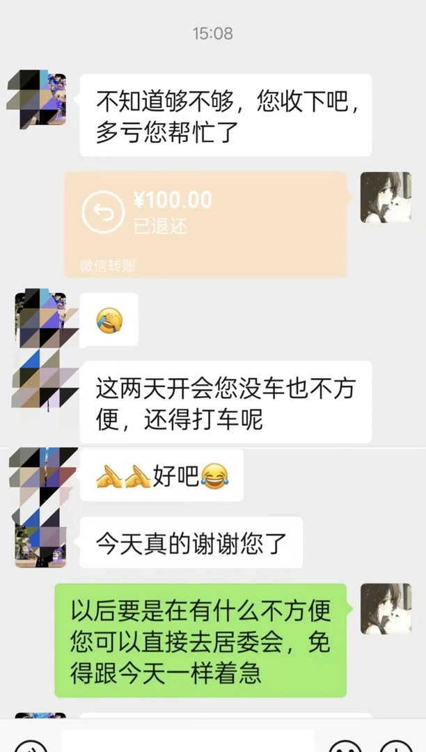 当天下午3时许,马岩收到了李先生发来的微信:“非常感谢帮助,我们从医院回来了,判断是胃肠功能紊乱引起的,医生说可能是这段时间太劳累了。”紧接着,一条100元的转账信息弹了出来,“麻烦您打车,而且增加了不便,不知道够不够,您收下。”马岩婉拒了李先生的好意,并将钱退了回去。可李先生执意要补偿打车费,马岩几番推拒不成,最终只收下了实际产生的14元打车钱。