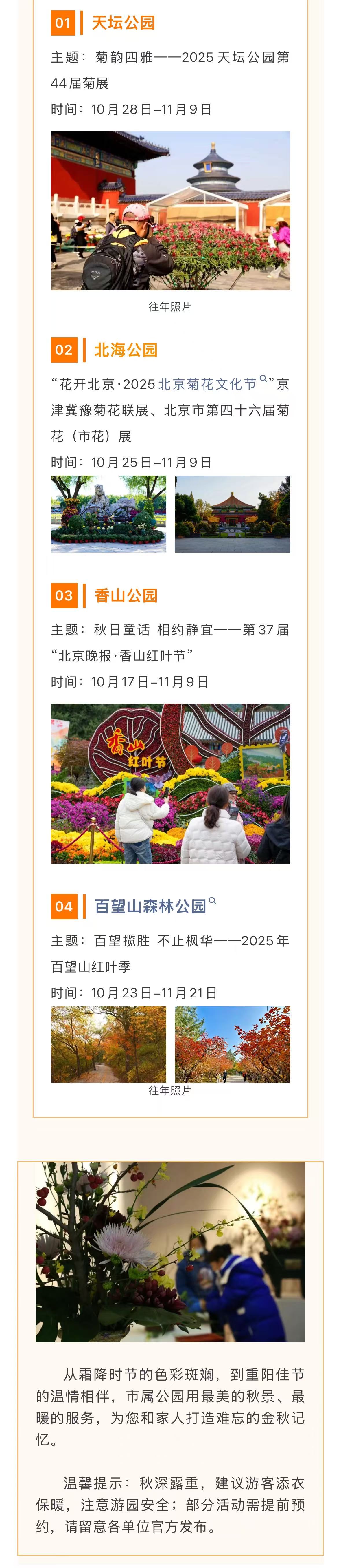 十月下旬,市属公园的红叶与菊展也将接连登场,为您呈现一场视觉盛宴。
