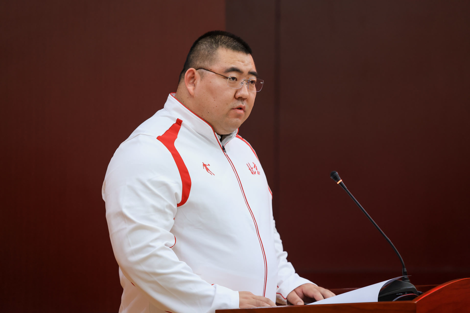 作为运动员代表在大会上发言的举重运动员艾雨南,即将第五次走上全运会赛场,参加将于11月20日在东莞举行的男子109公斤以上级比赛。