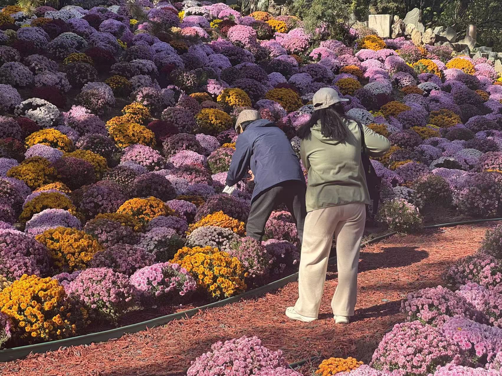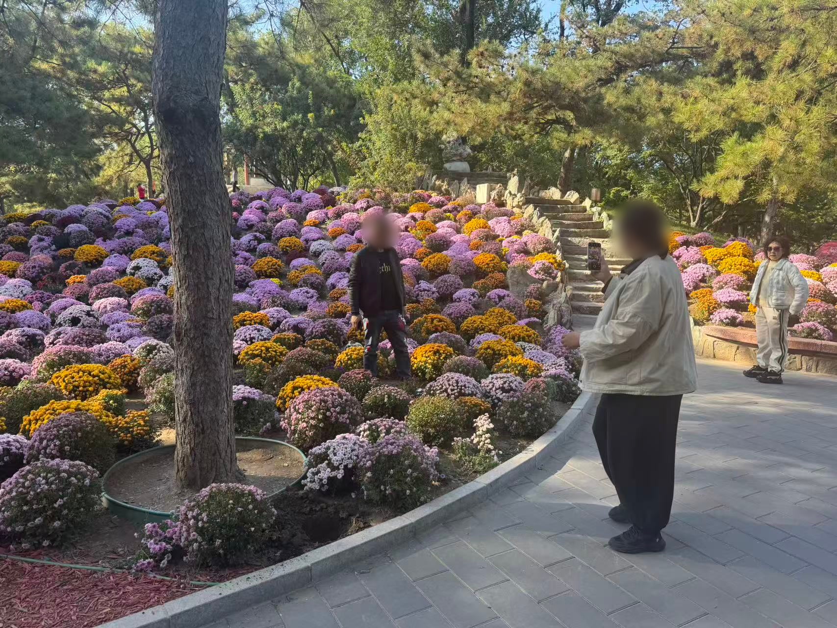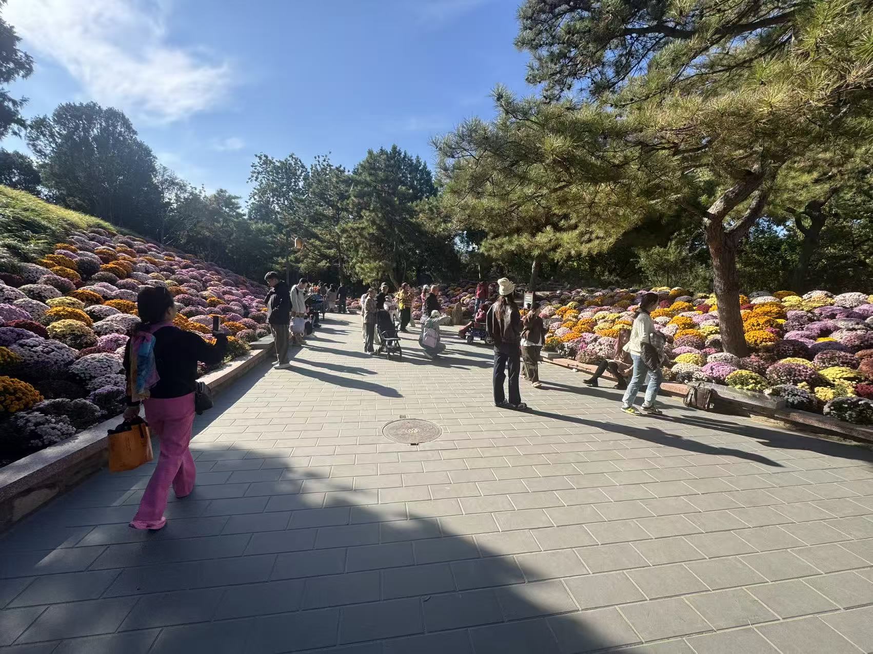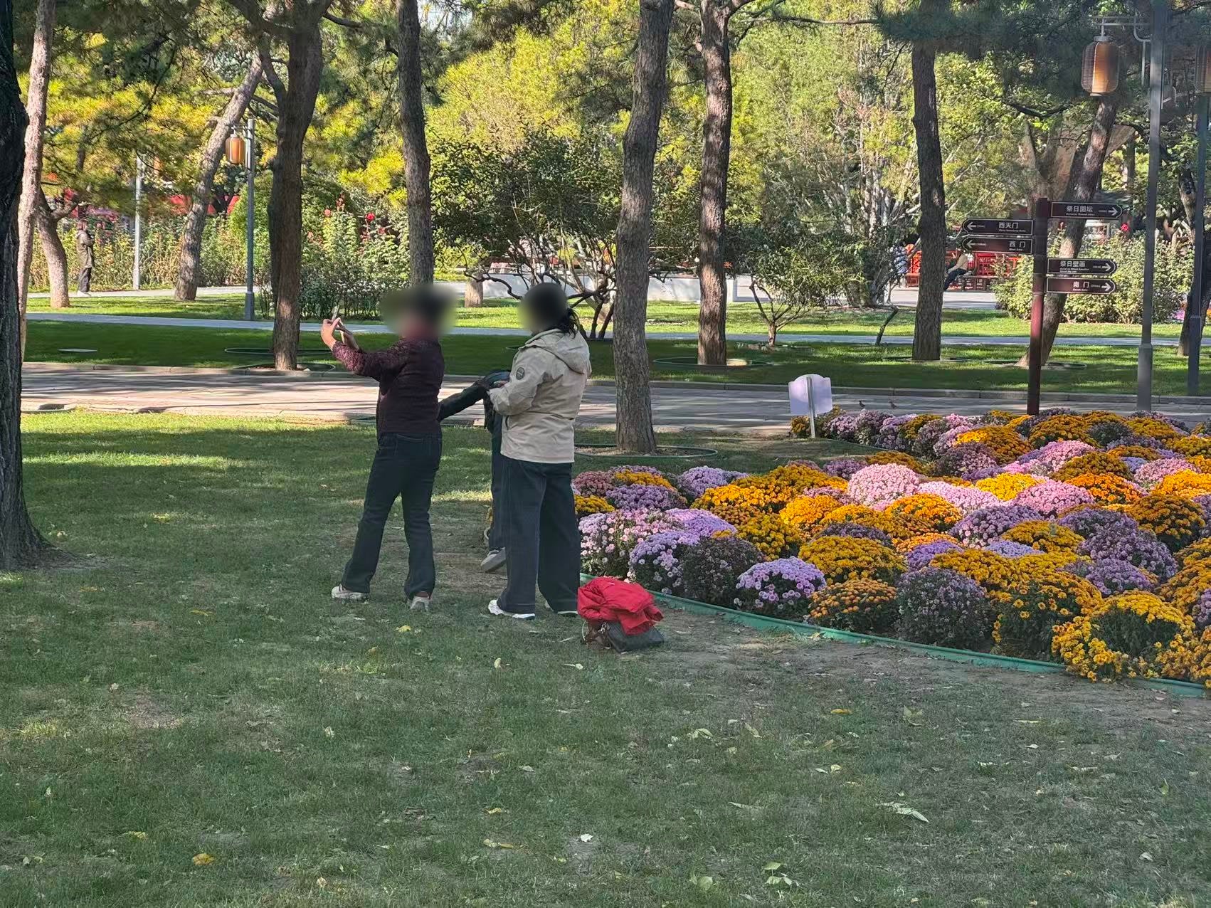 在日坛公园菊花谷内,十几个品种8000多株菊花交错铺在土坡上,犹如打翻的秋日调色盘。小路上、廊亭旁,随处可见手持手机、自拍杆以及专业三脚架的游客在拍照录像。然而在绚烂花海中,不文明行为时有发生:有人踏入花丛专注拍照,也有人在艺术装置旁随意踩踏草坪。