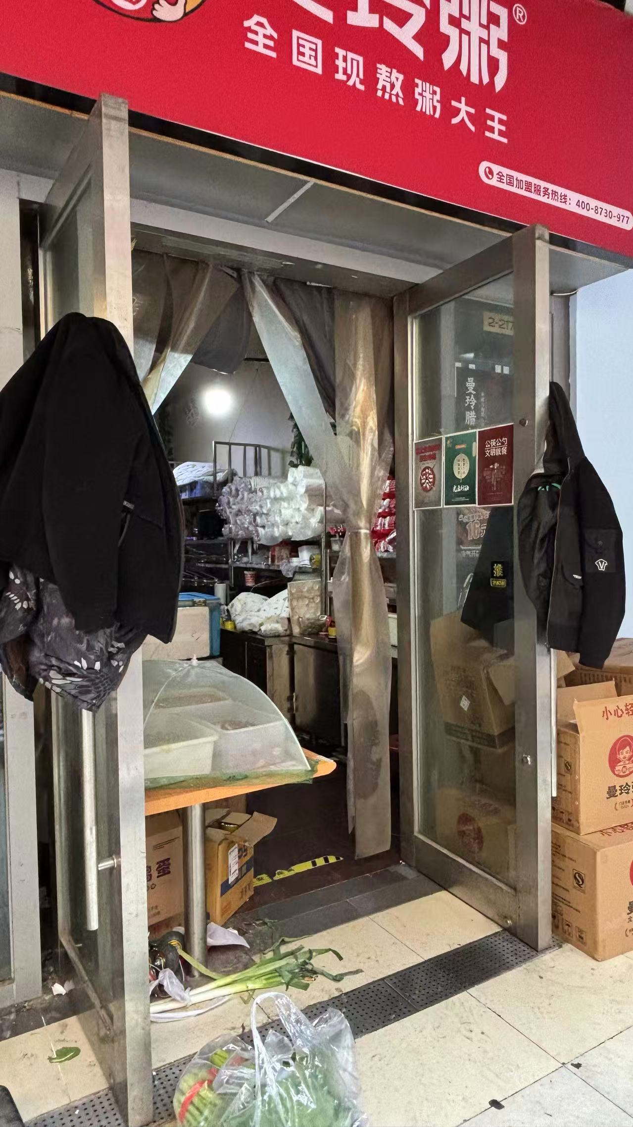 此外,还有一家主打“现熬粥”的连锁店,其平台“实拍图”显示,堂食区域至少有六组桌椅。记者在现场看到,该档口实际上仅有操作区域,货架满满当当,员工的外套只能搭在门把上,袋装蔬菜直接置于门外地面,并无堂食空间。