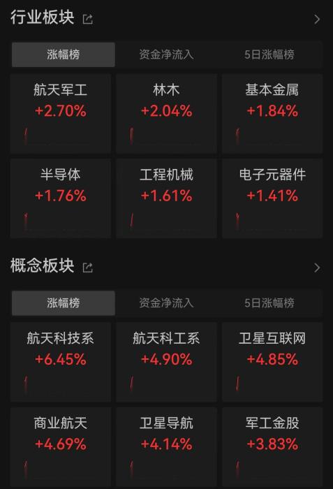 盘初,航天军工板块涨幅居前。概念板块方面,航天科技系、航天科工系等表现亮眼。
