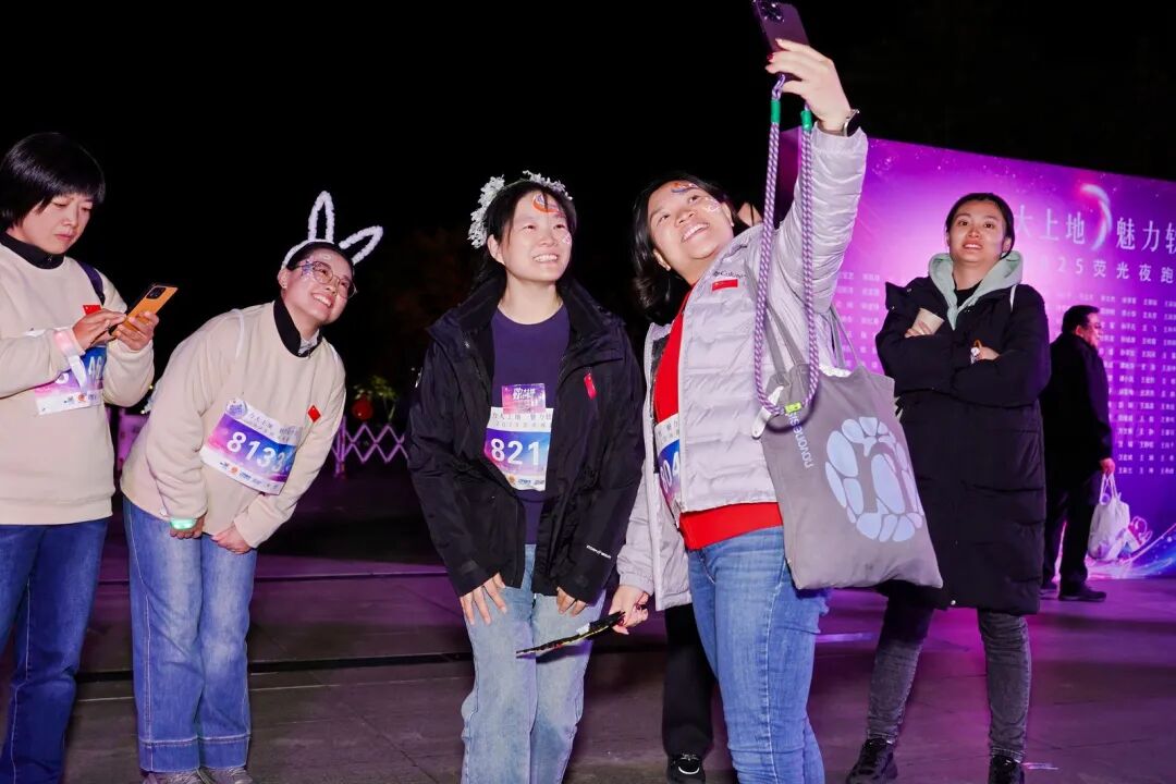 傍晚时分,参赛者们陆续抵达活动现场。动感音乐在空气中回荡,工作人员热情地为每位参与者发放荧光手环、荧光头饰等发光装备。这些发光饰品在夜色中格外耀眼,瞬间将整个活动现场变成了一个荧光闪耀的欢乐海洋。参与者们互相帮忙佩戴荧光饰品,还不忘拿出手机彼此拍照留念。