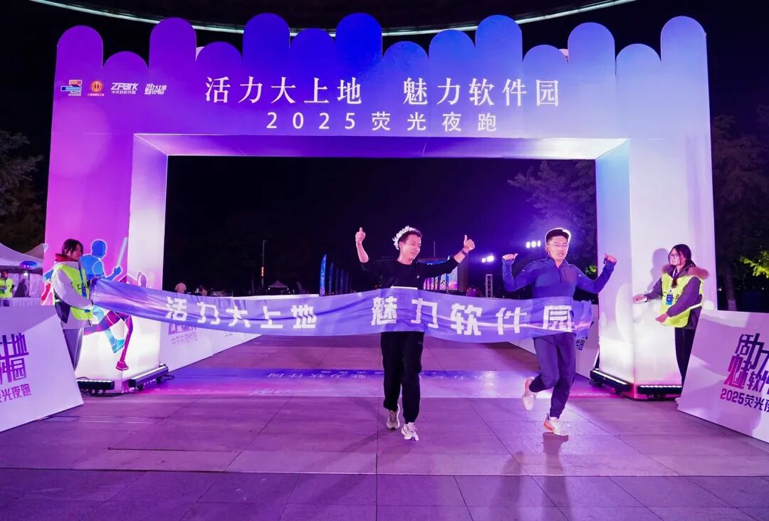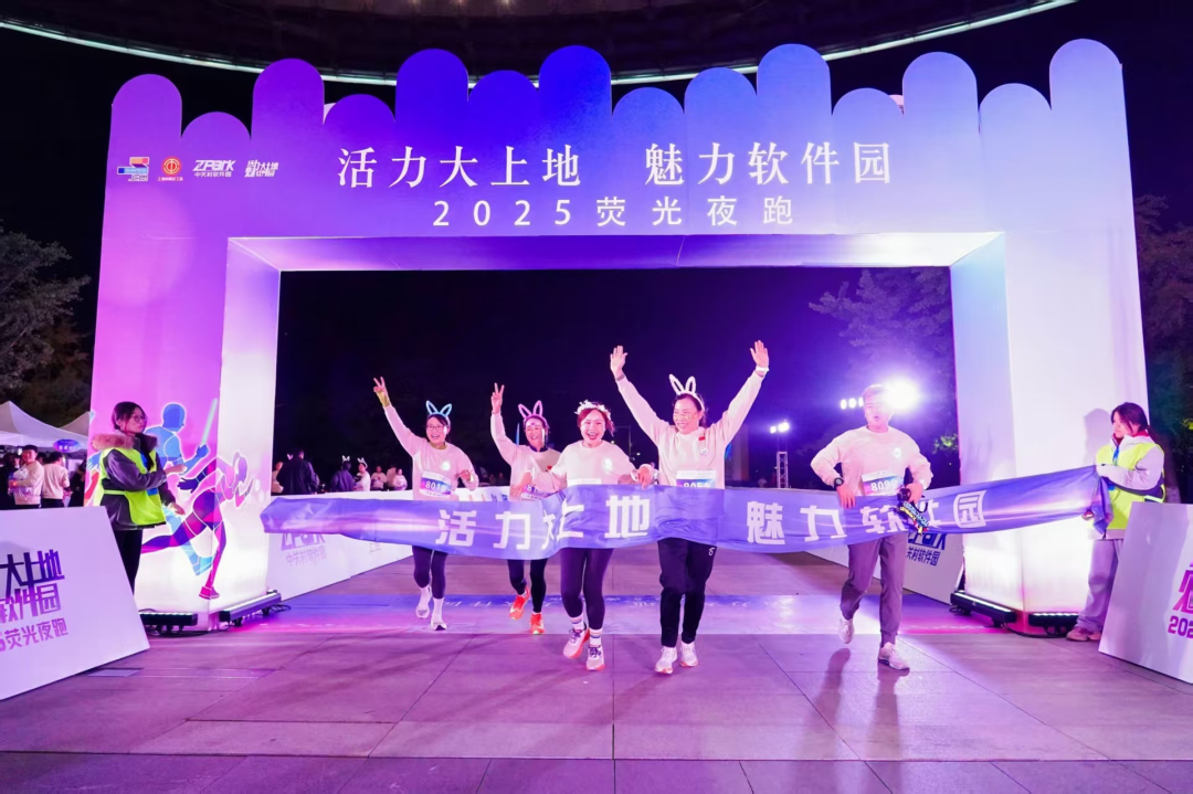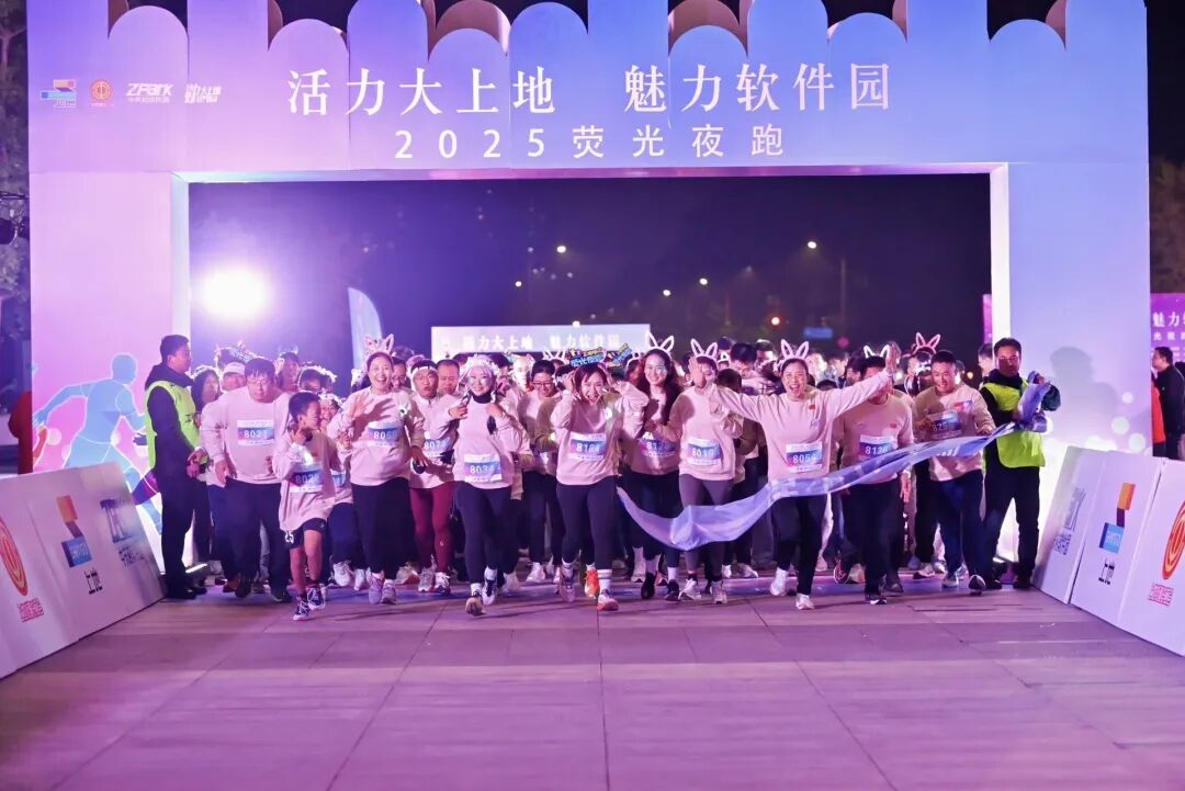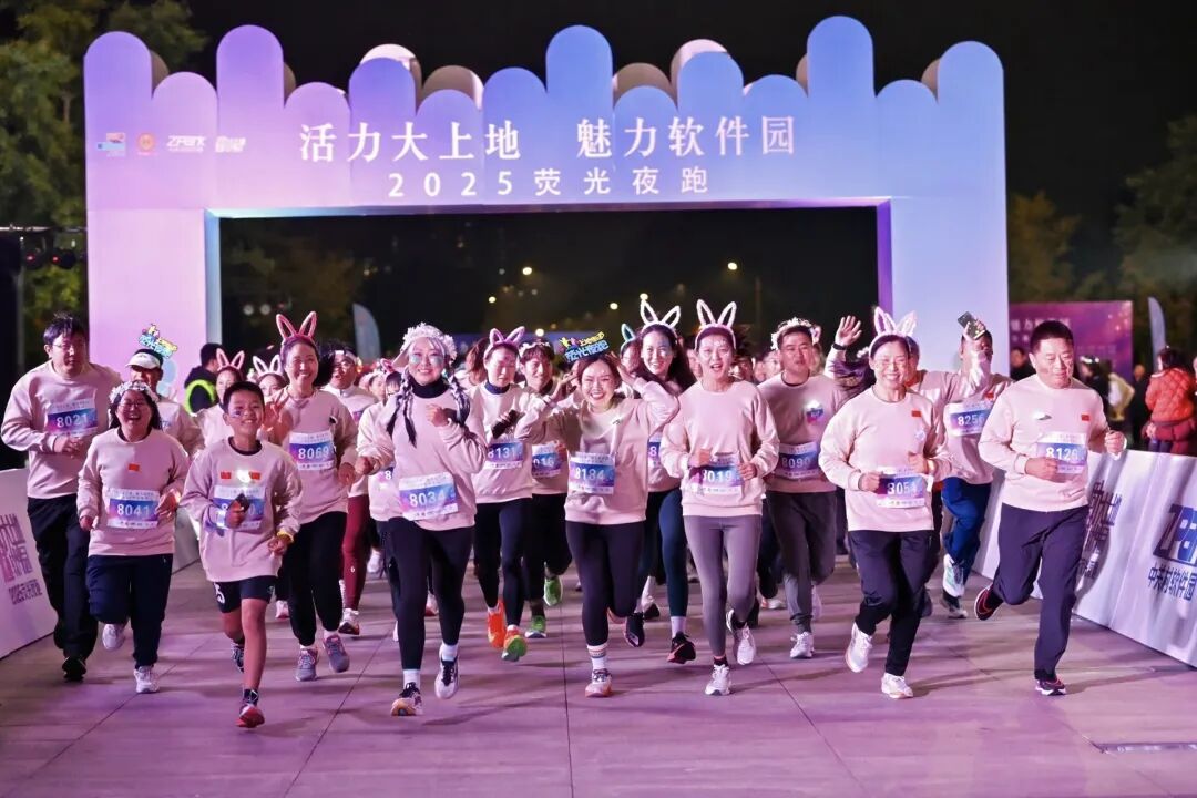 随后,参赛者们沿着软件园精心规划的跑道开启了荧光夜跑之旅。涌动的人群在跑道上形成了一条绚丽的光流,与园区夜晚的灯光交相辉映。