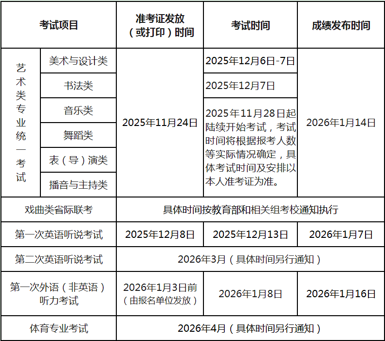 2026年普通高等学校招生艺术类专业统一考试、体育专业考试、英语听说考试、外语(非英语)听力考试报名与高考报名同期进行,符合条件拟报名参加相关考试的考生须选报相关项目并缴费。部分考试时间安排见下↓